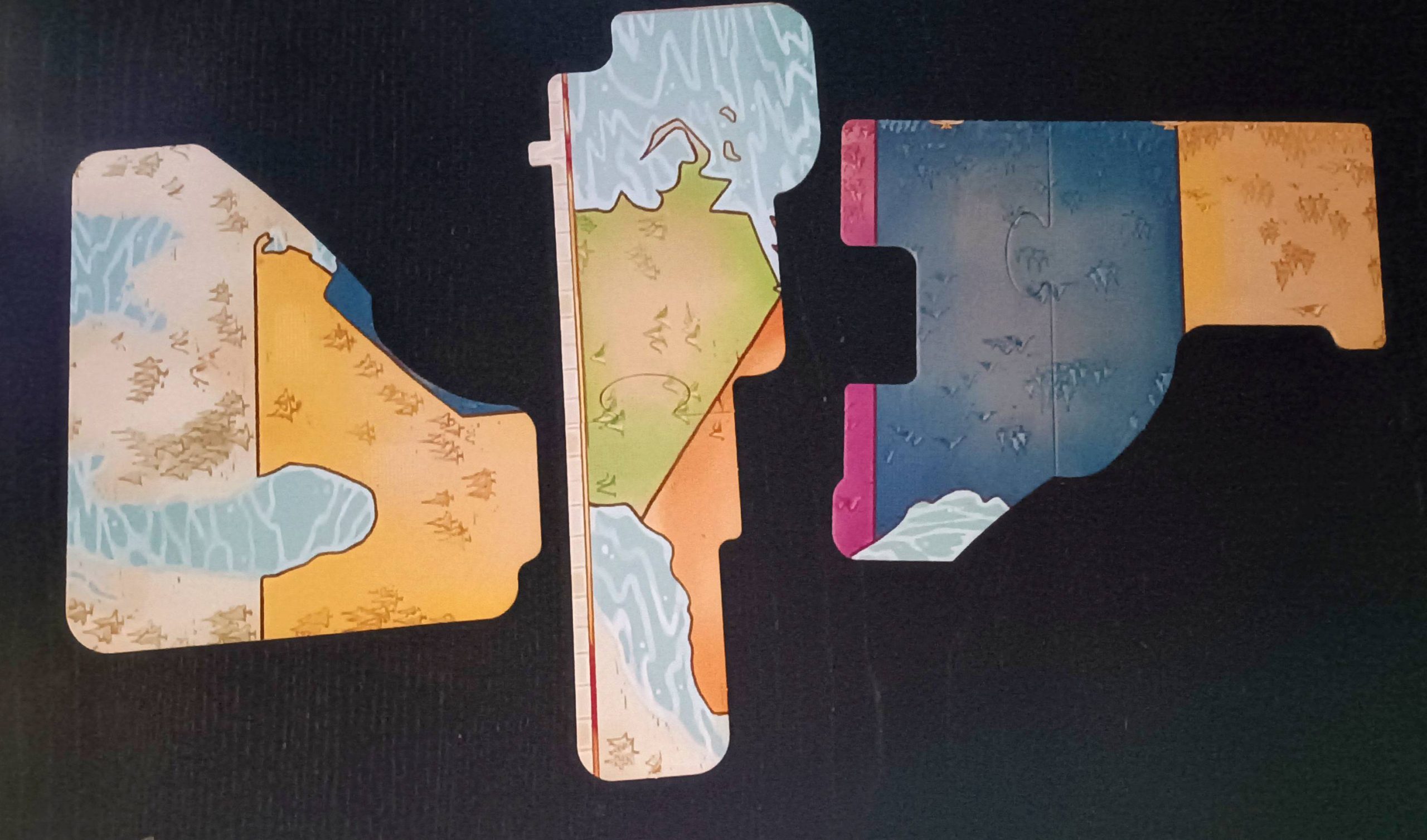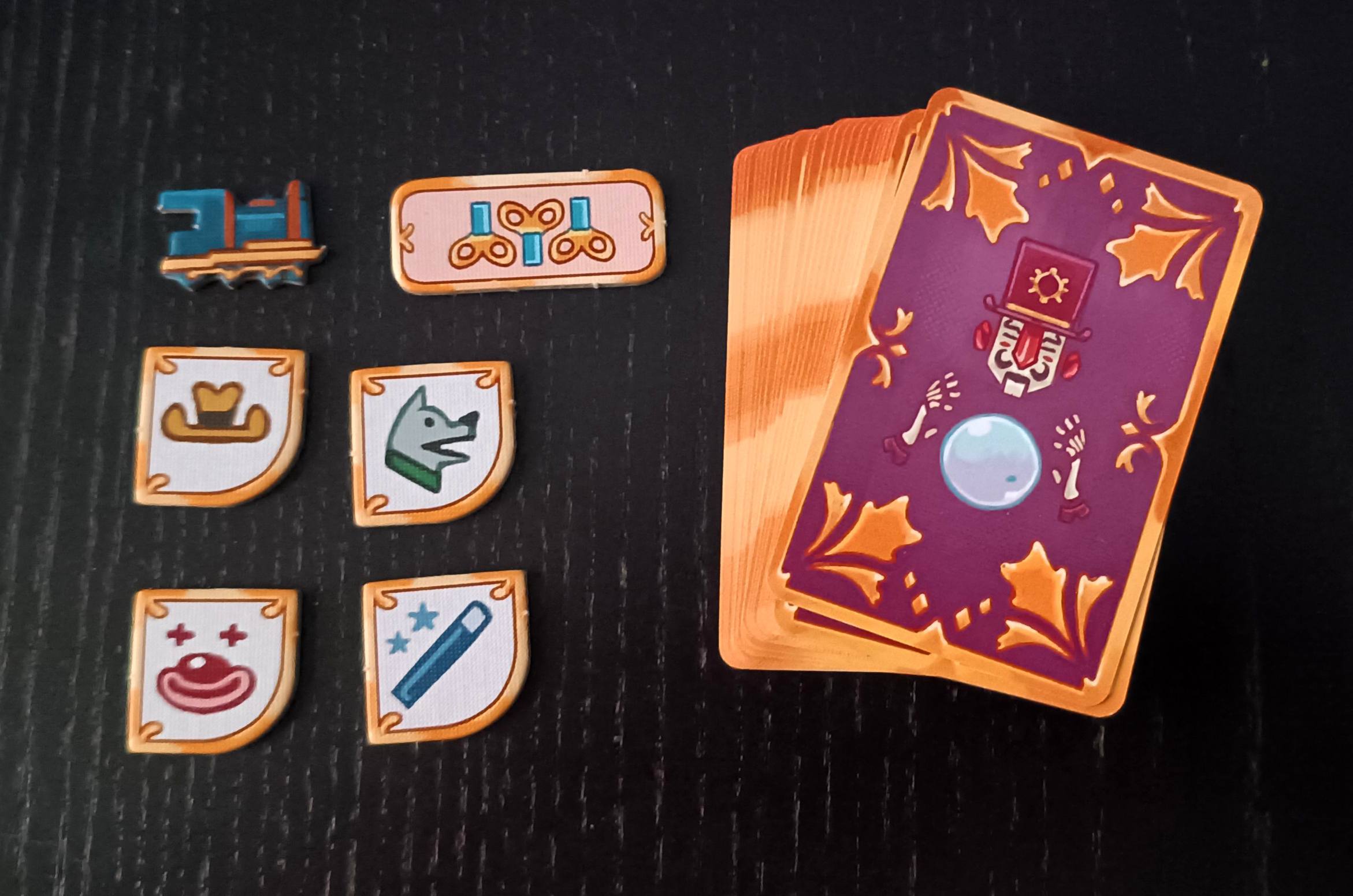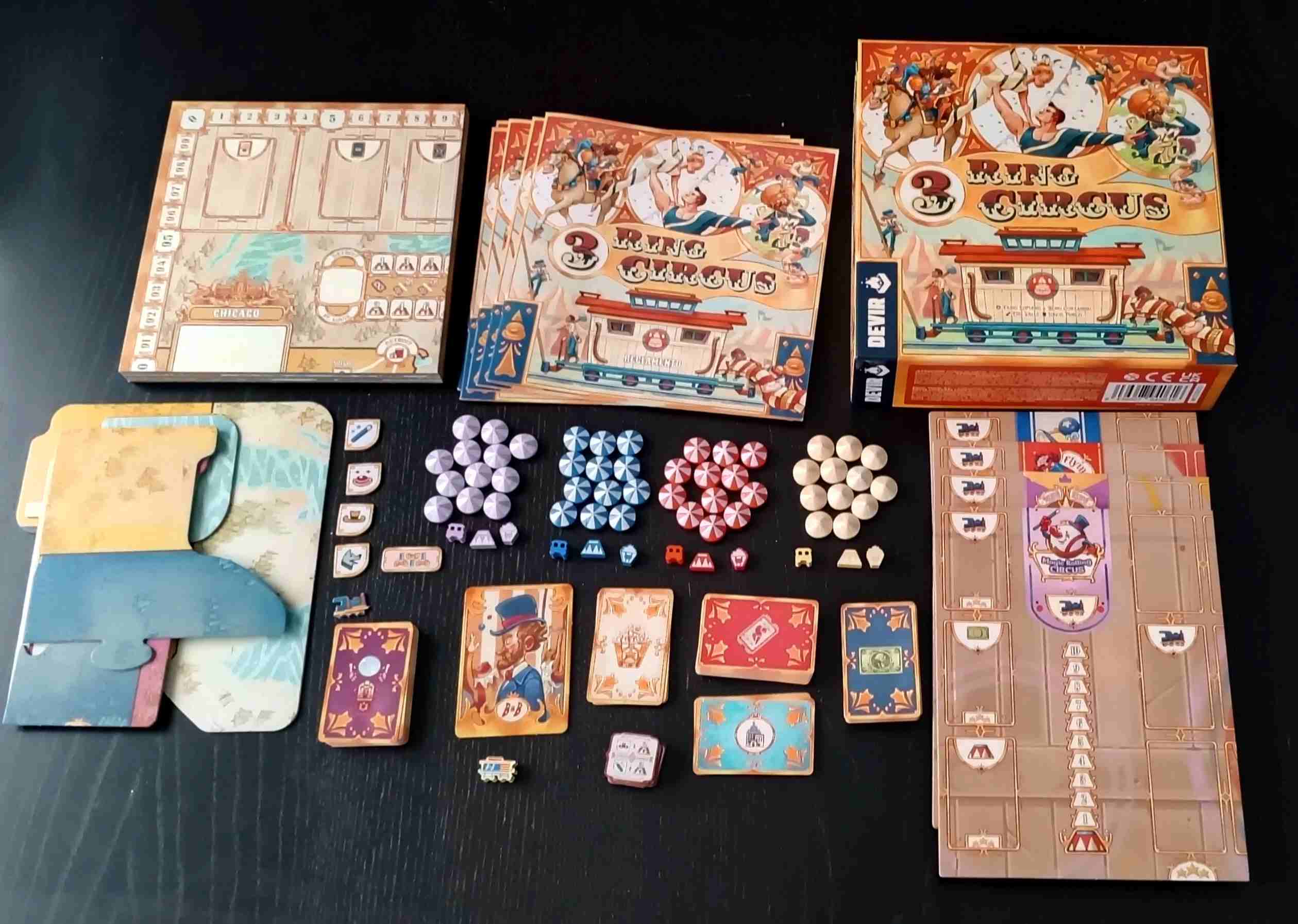Si hablamos de los tableros, tenemos por un lado los personales, que son plegables y de muy buena calidad con el logo de cada compañía de circo, el tablero común bien diseñado con sus regiones y rutas y que guarda consonancia en colores con todo el juego y las losetas de tapar terreno cuyos colores coinciden con las zonas a las que corresponden para ocultar.