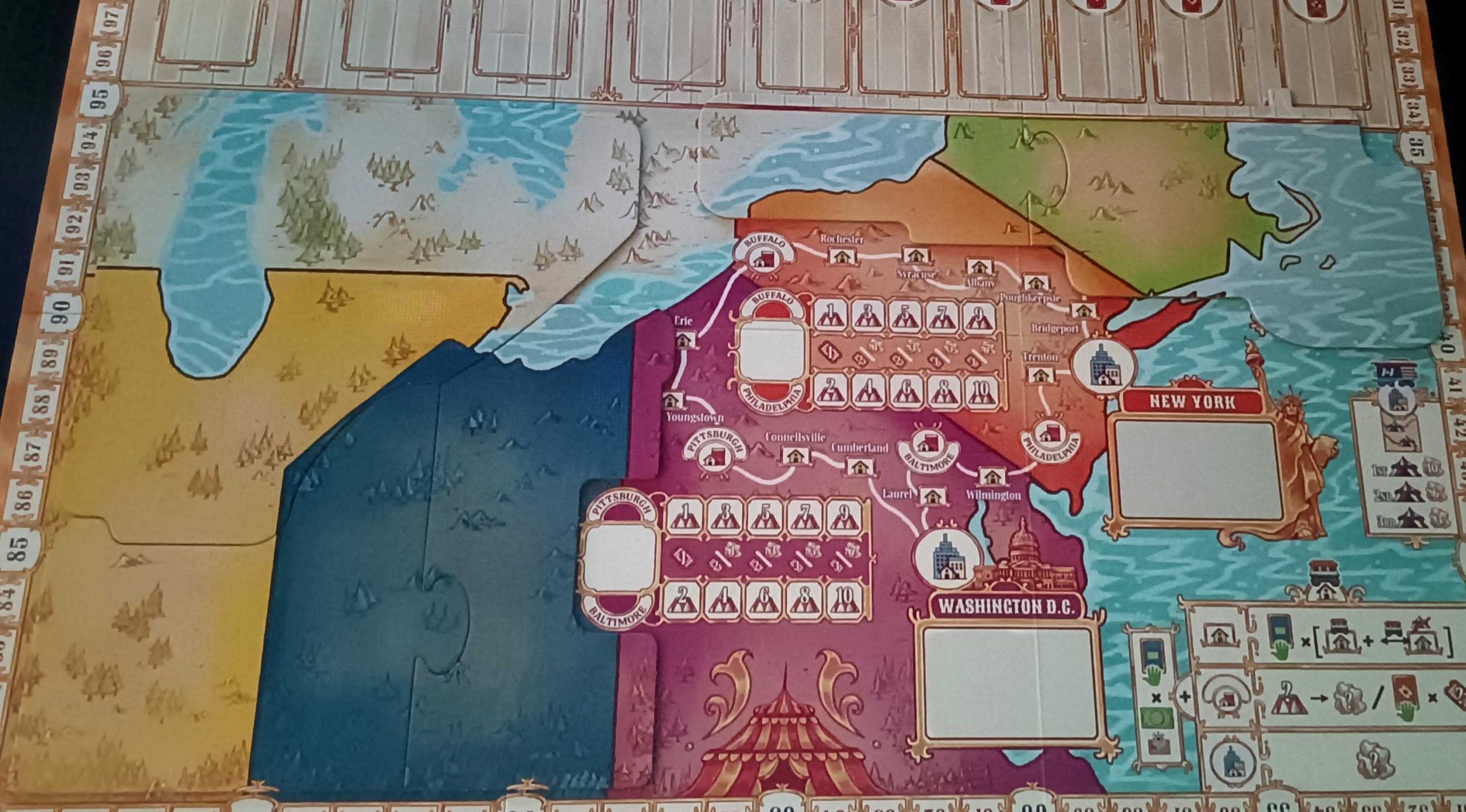 - EL CIRCO BARNUM EMPIEZA EN NUEVA YORK: Si somos dos jugadores, al preparar la partida, taparemos las regiones de Boston y Chicago. La caravana Barnum empezará en Nueva York y se moverá en sentido antihorario. Puntuaremos las regiones en este orden: Indianápolis, Washington D.C. y Nueva York.