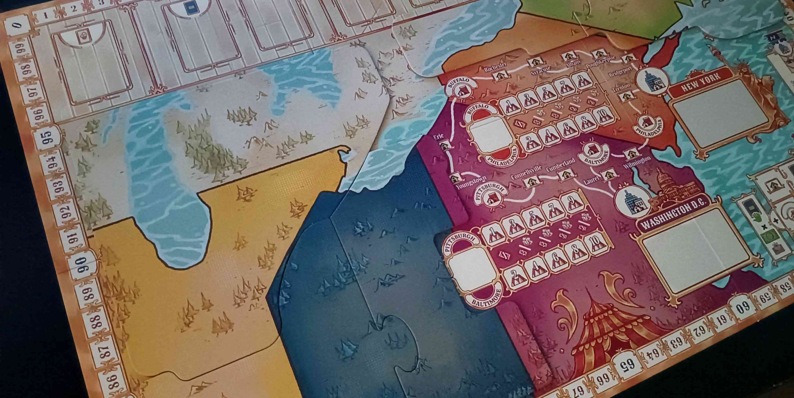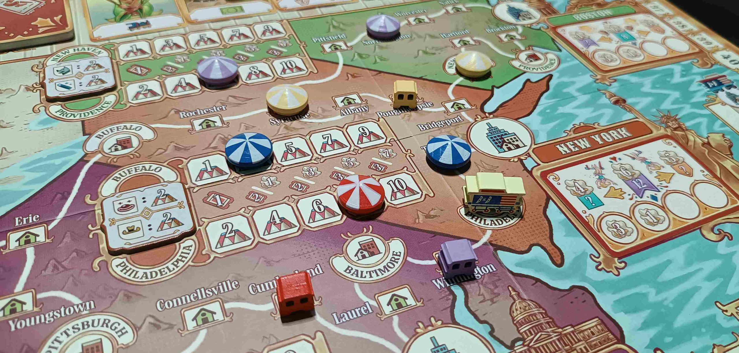 Mezclaremos las losetas de ciudad pequeña y colocaremos una al azar en cada región del mapa disponible. Igual con las cartas de gran ciudad, para las ciudades activas. El tren del circo de Barnum se coloca en Boston y, si esta región está bloqueada, saldrá de New York.