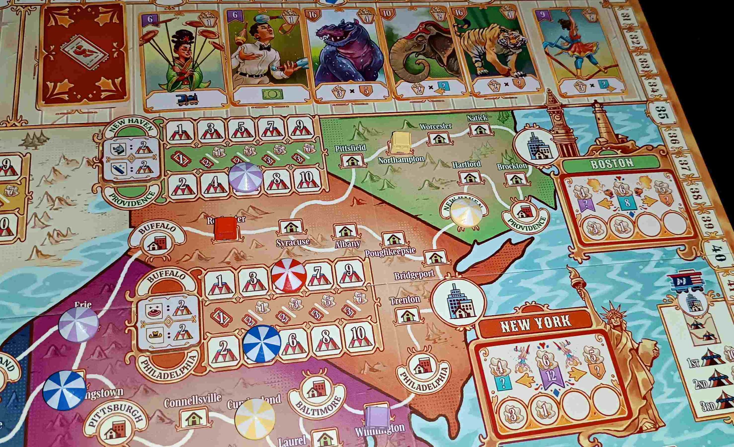 Colocaremos losetas de ciudad pequeña de manera aleatoria y las cartas de gran ciudad en las ciudades activas. La caravana del circo de Barnum se coloca en Boston y, si esta región está bloqueada, saldrá de New York.