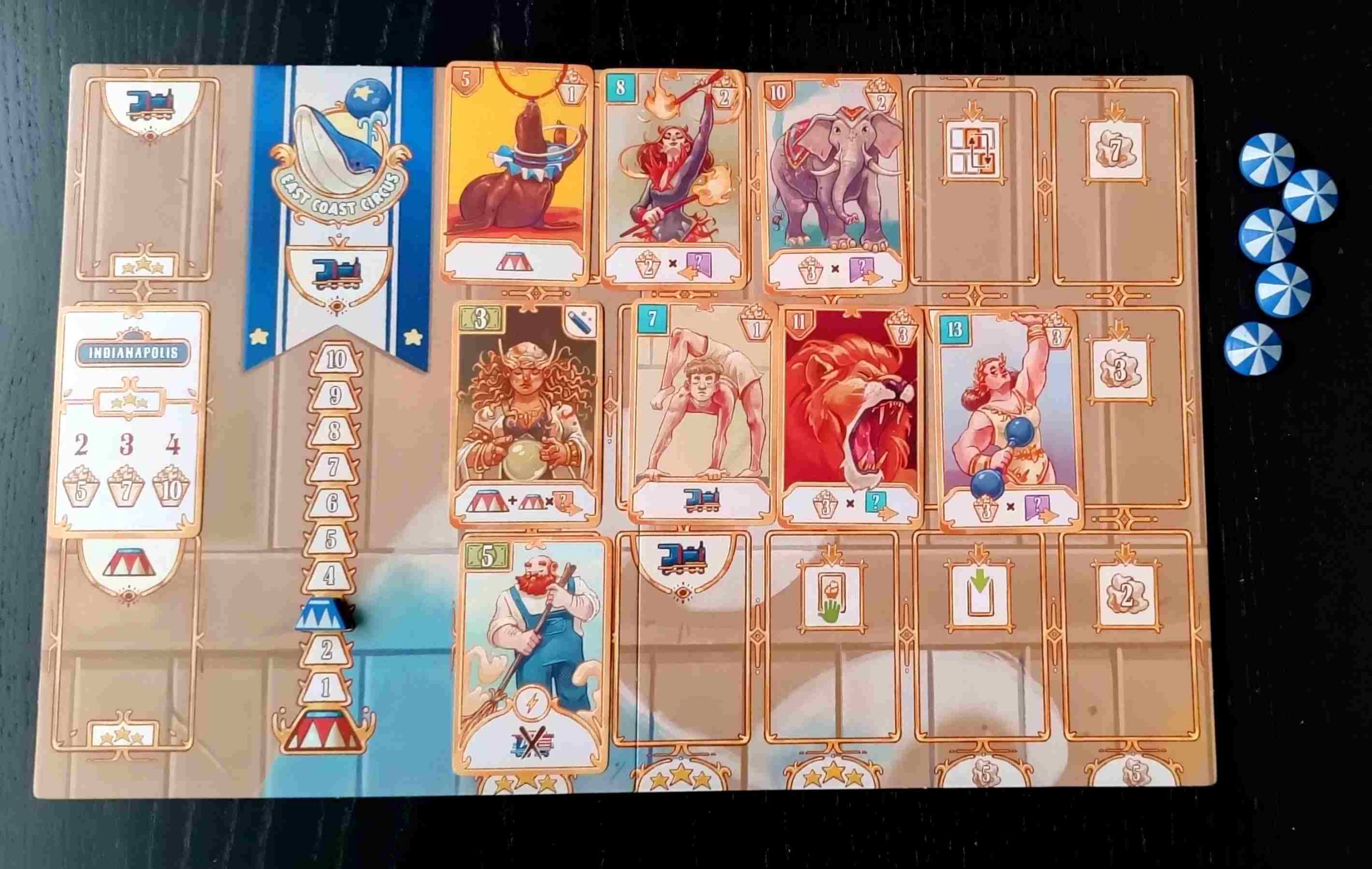 Cada tablero de circo individual tiene quince espacios para artistas, distribuidos en tres filas de cinco cartas cada una. Además, en el margen izquierdo del tablero de circo tenemos tres espacios adicionales, para las cartas que se puntúan al final de la partida.