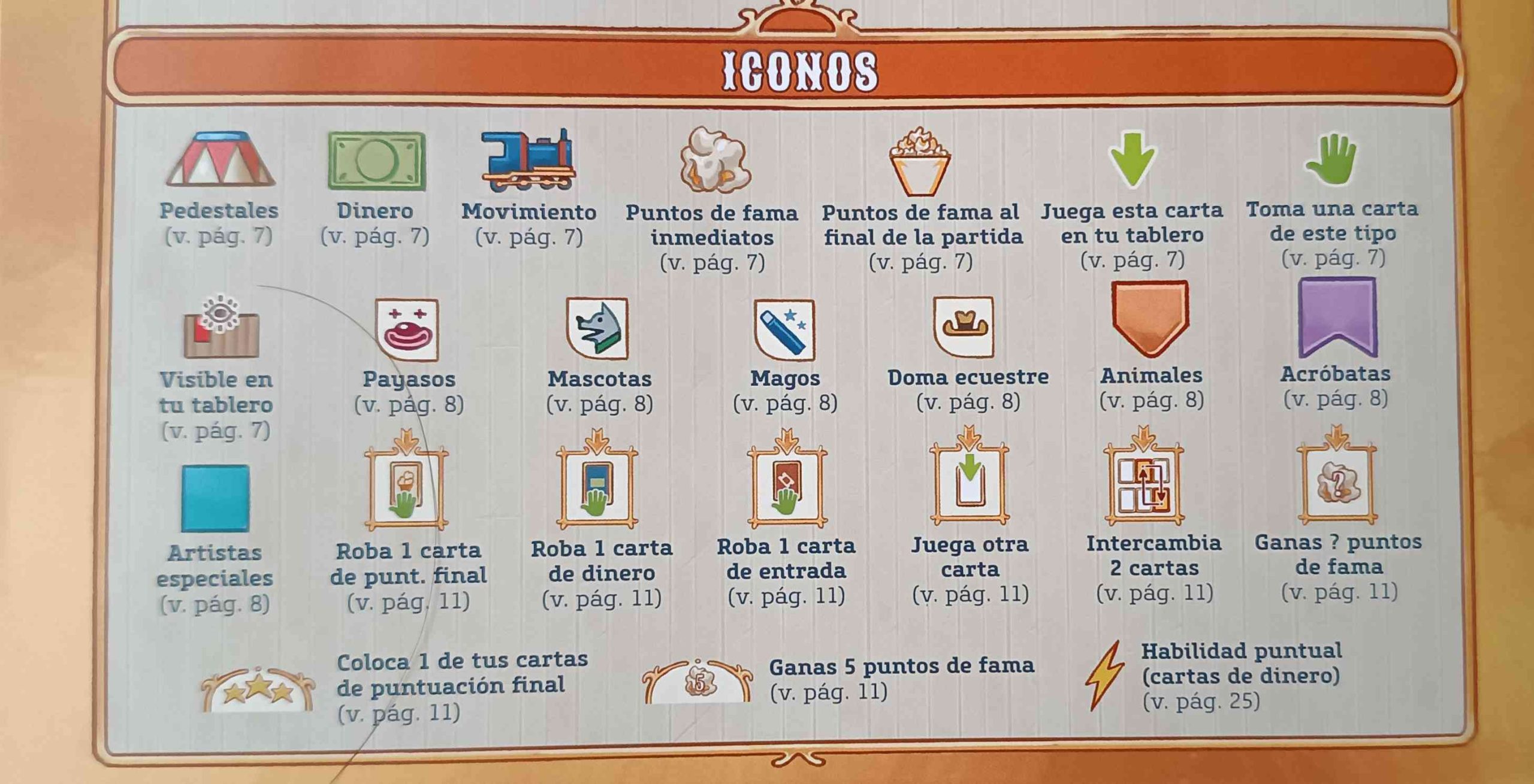 También tenemos las cartas, de tamaño pequeño y repletas de información con ilustraciones, a cargo de Edu Vals, con todo detalle que harán el juego más inmersivo. Utiliza unos colores y unas tonalidades que le dotan al juego de ese sentimiento nostálgico pero de diversión al que nos transporta el ambiente del circo. Estas cartas contienen también mucha iconografía que tendremos bien explicada en el manual y que una vez que conozcamos bien nos guiará paso a paso para realizar las acciones del juego.