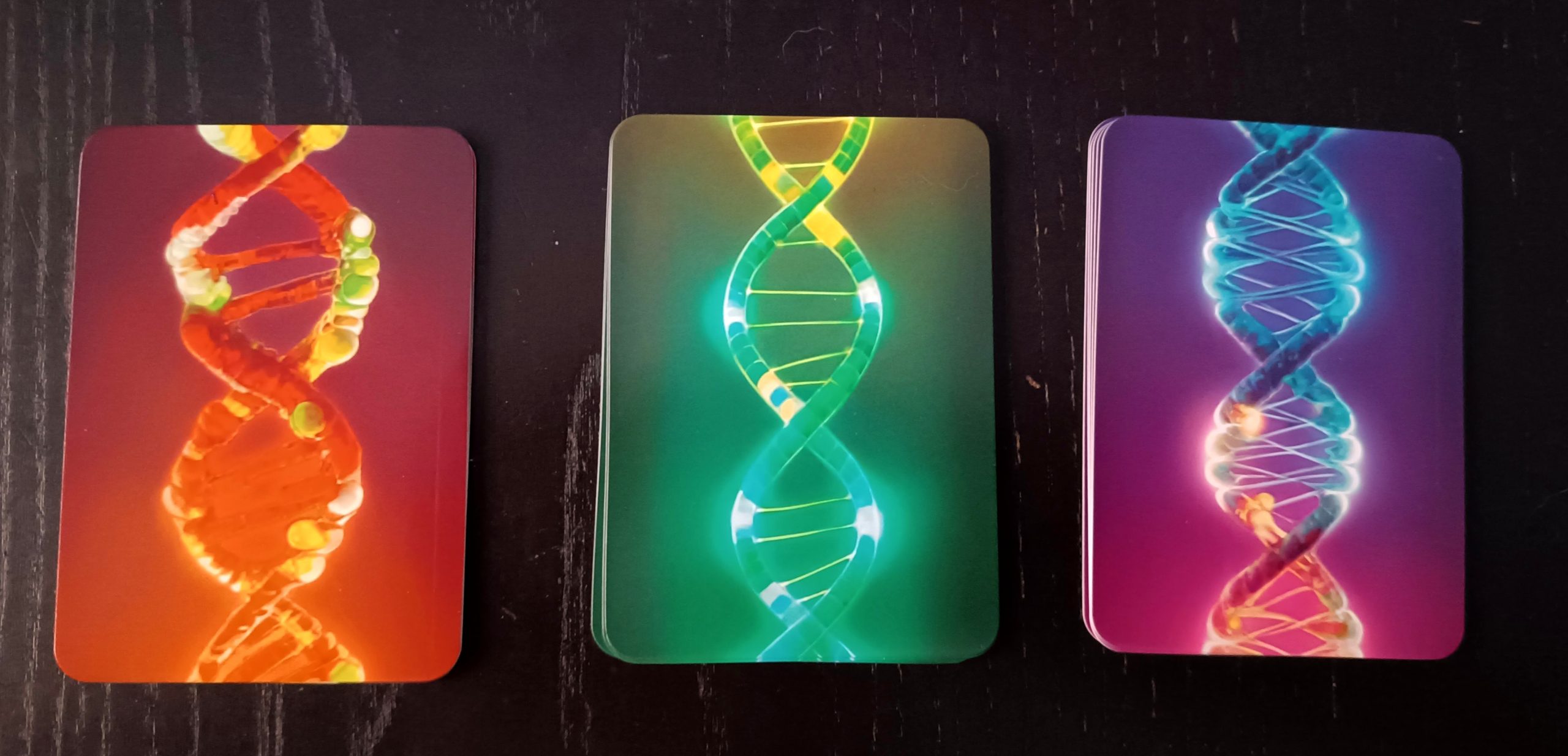 La baraja está compuesta por cartas que utilizará el jugador que encarne al GENETISTA y otras diferentes que utilizará la persona que juegue como ADAPTOIDE.