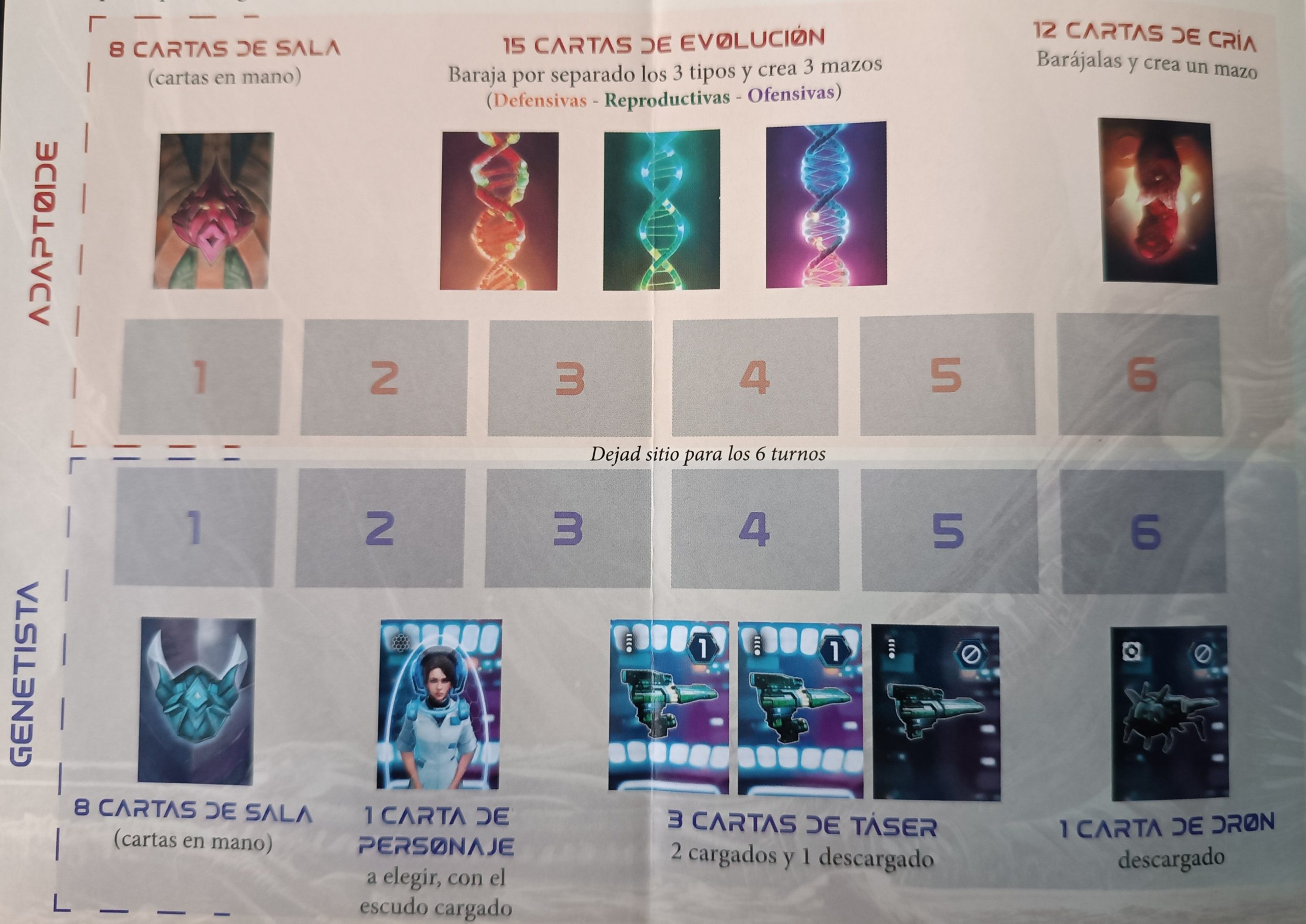 Cada uno de los jugadores elegirá un bando, el de ADAPTOIDE o el de GENETISTA y coge las cartas de dicho bando y las coloca según se muestra en la imagen.
