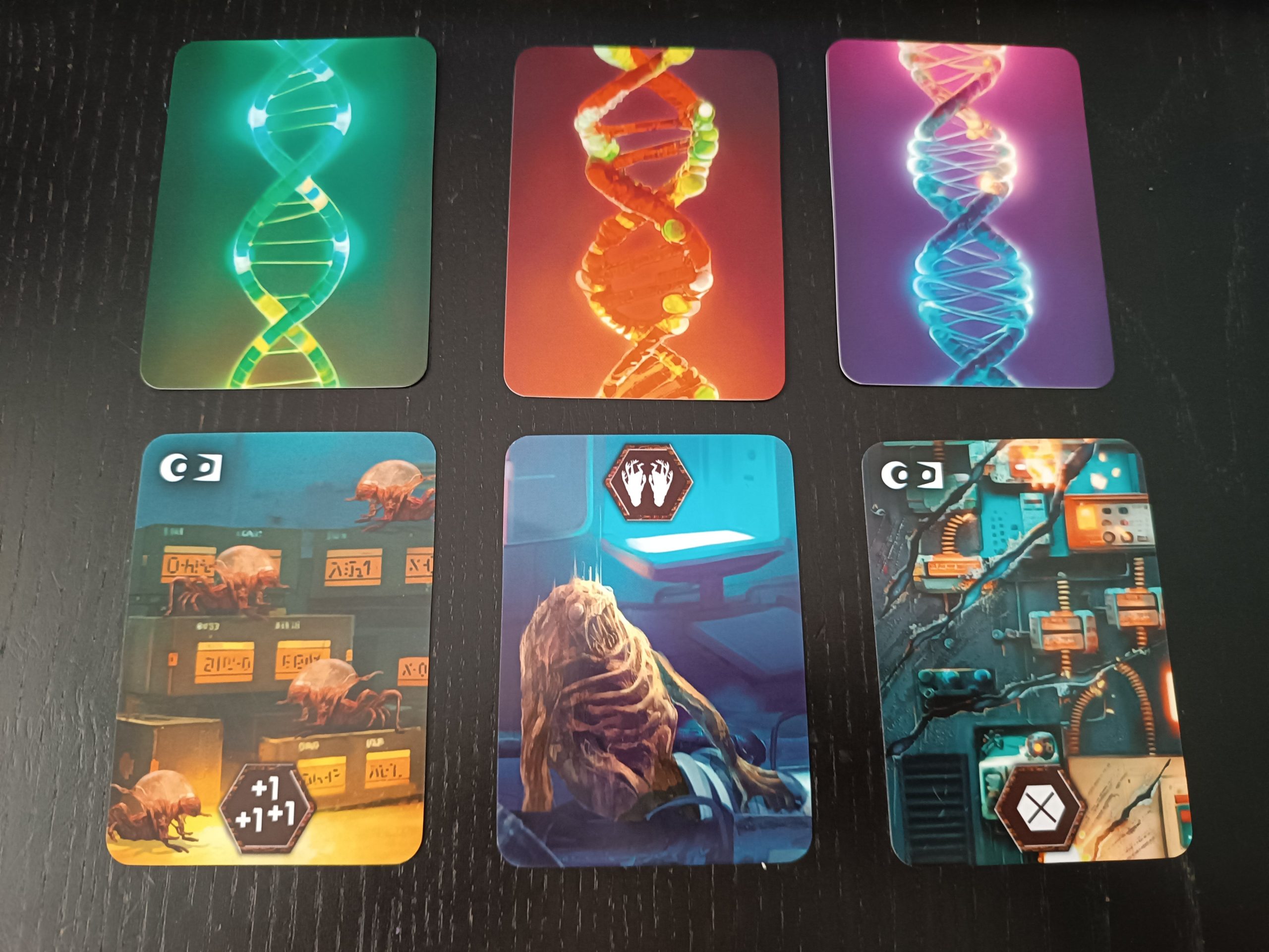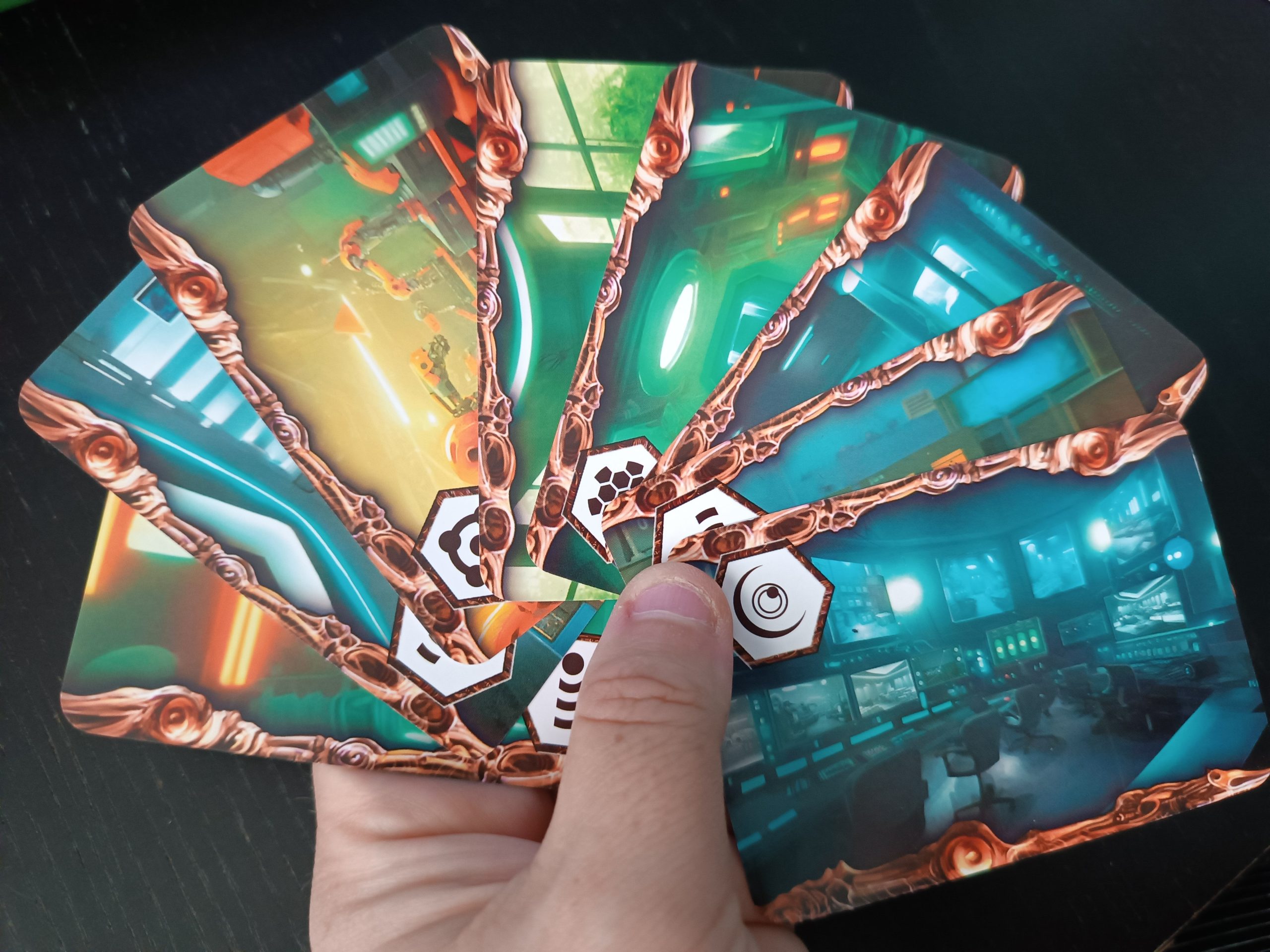 - Cada carta representa una habitación de las instalaciones que podrás visitar. Elije una carta cada turno y utiliza su habilidad como genetista o inféstala de crías como adaptoide.