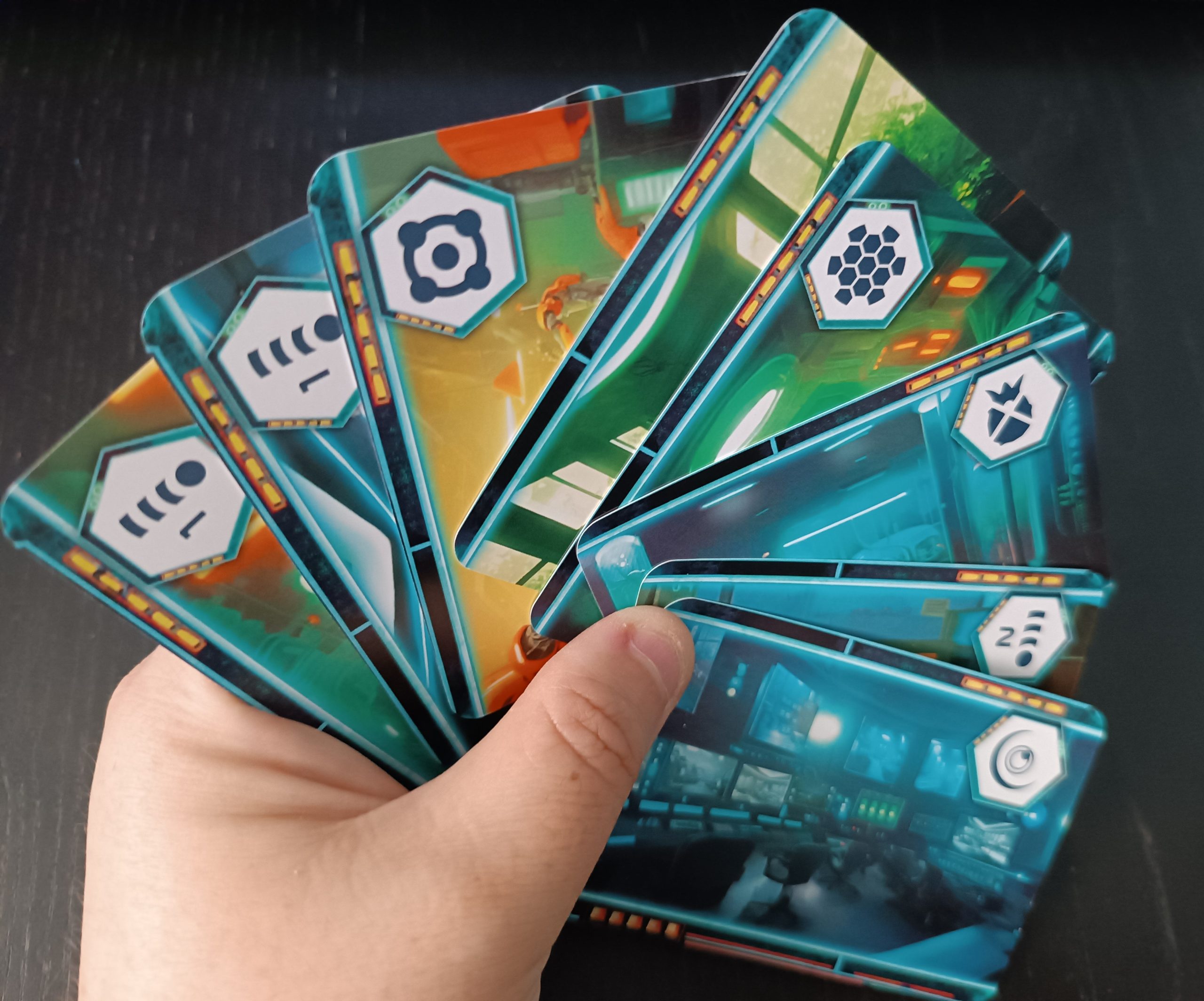 Hay 8 cartas de sala diferentes que, según vayamos desvelando, nos indicarán una acción que debemos realizar y que sucede en dicha sala. Por ejemplo, si se desvela el almacén tendremos que voltear hasta 2 cartas de táser para mostrar su cara cargada, si es la sala de control el ADAPTOIDE jugará la siguiente sala bocarriba antes que el oponente y así irán apareciendo y nos harán realizar las acciones que corresponda.