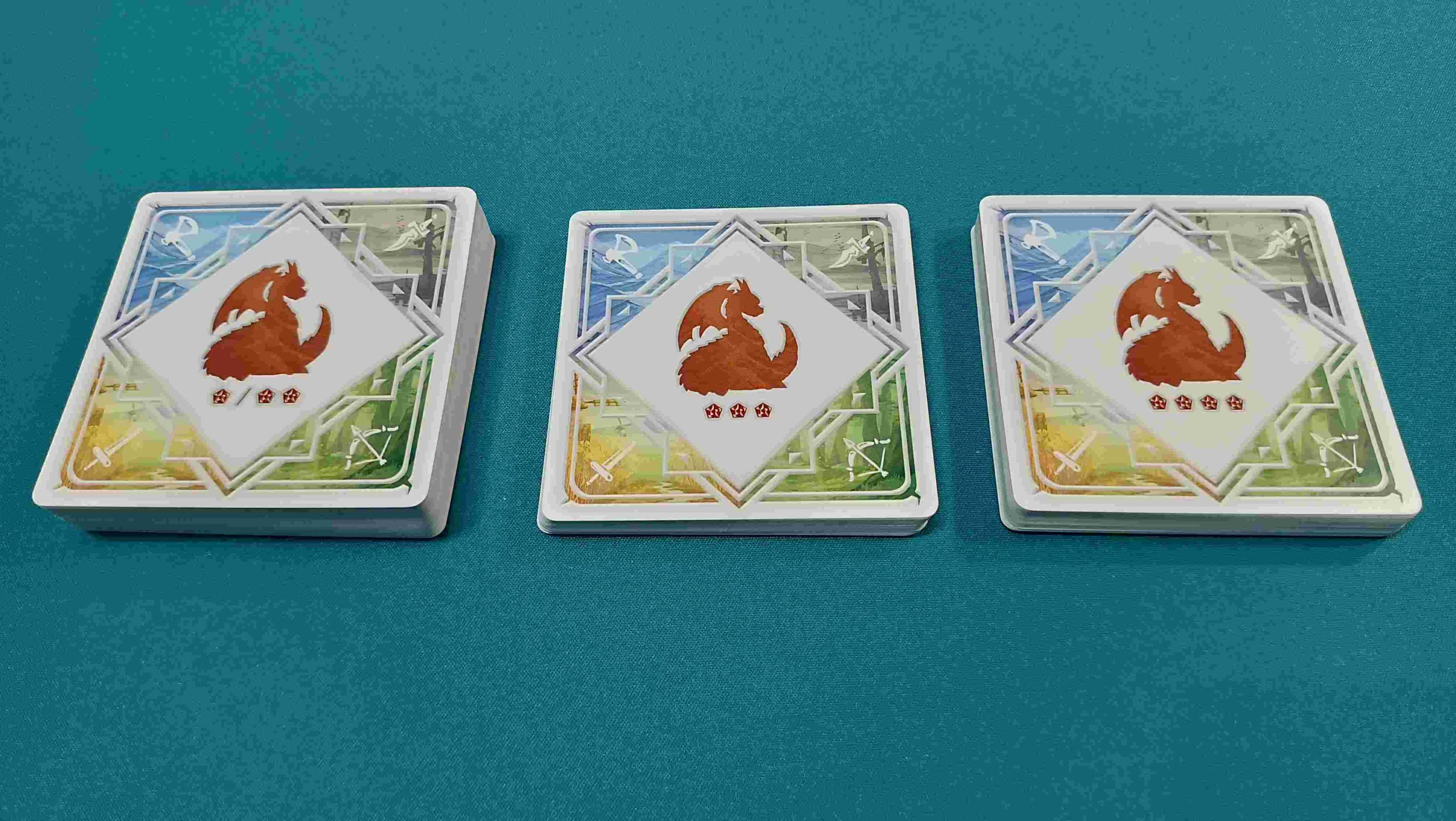 - Según el número de jugadores, retira las cartas con 3 y 4 piedras rojas (para dos jugadores), las cartas con 4 piedras rojas (para tres jugadores) o no retires ninguna carta (para cuatro jugadores).