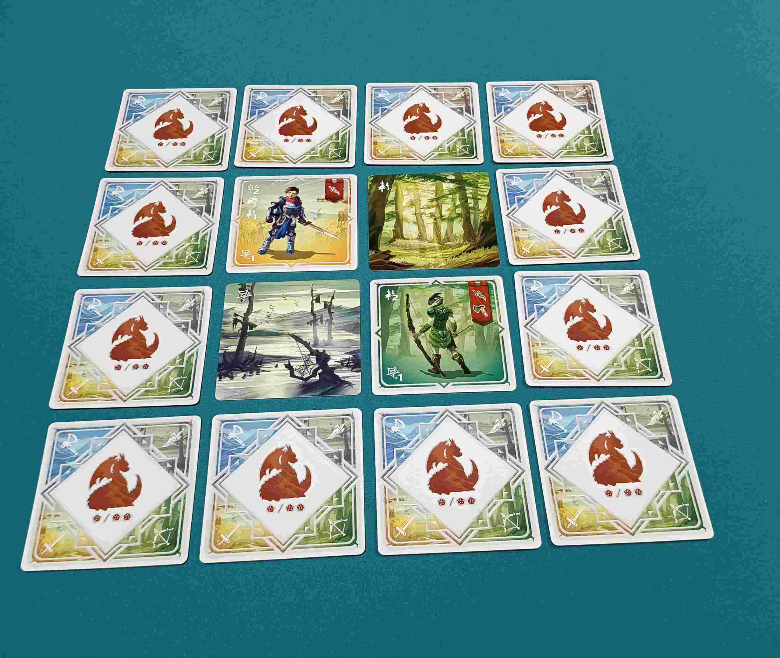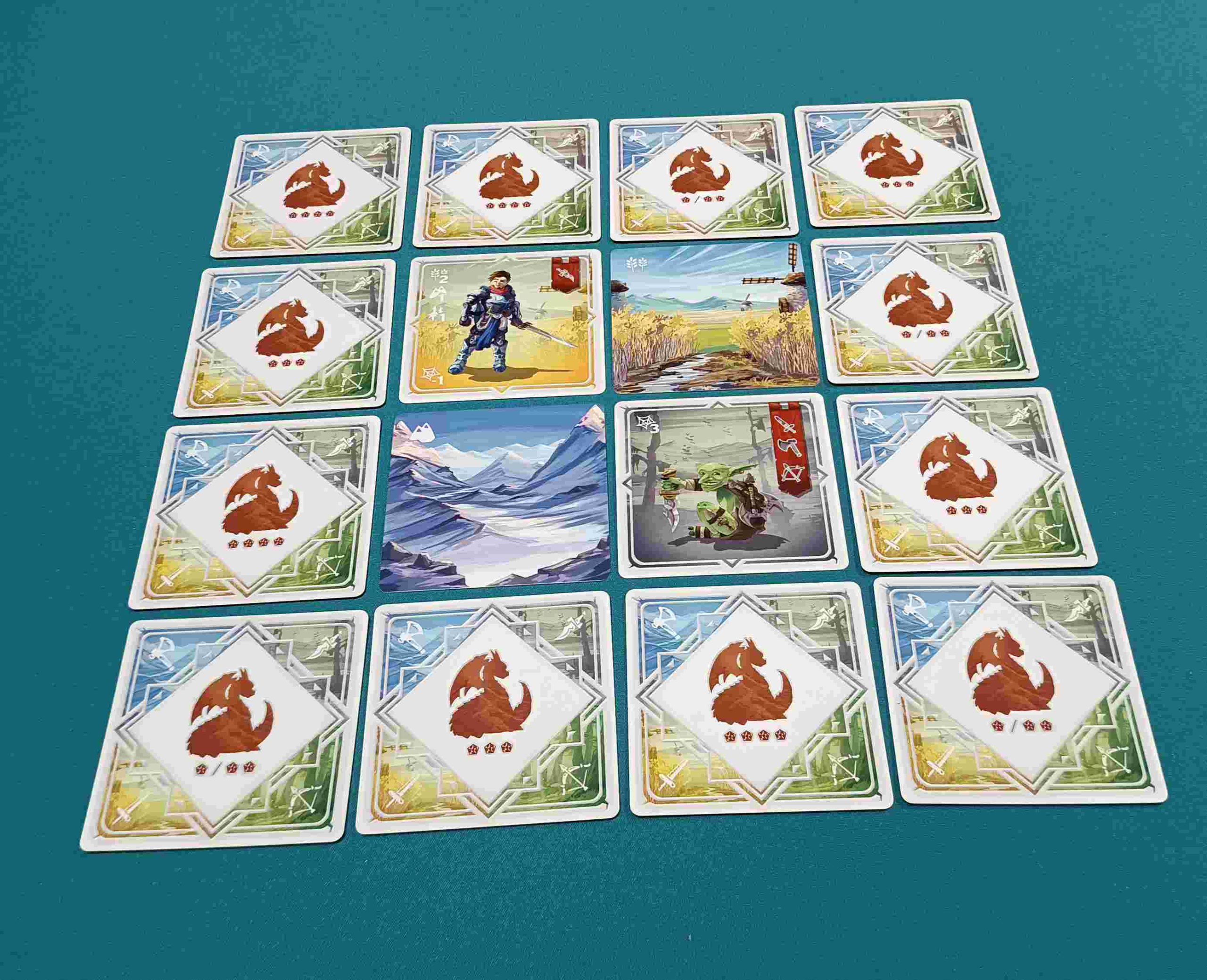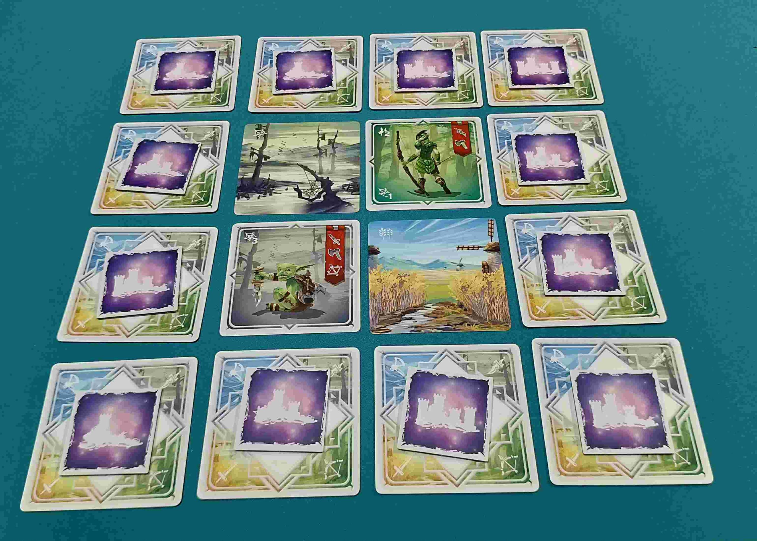 La preparación de la partida es muy sencilla. Cada jugador simplemente tiene que preparar su reino cogiendo 4 cartas y poniéndolas, bocarriba, formando una cuadrícula de 2×2 evitando que sean iguales y, a continuación, coge otras 12 y las coloca bocabajo alrededor de las primeras 4, formando con todas ellas una cuadrícula de 4×4.
