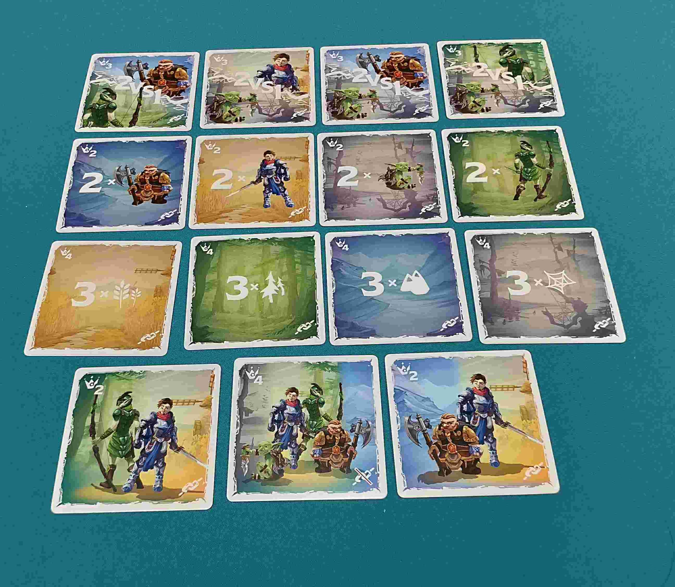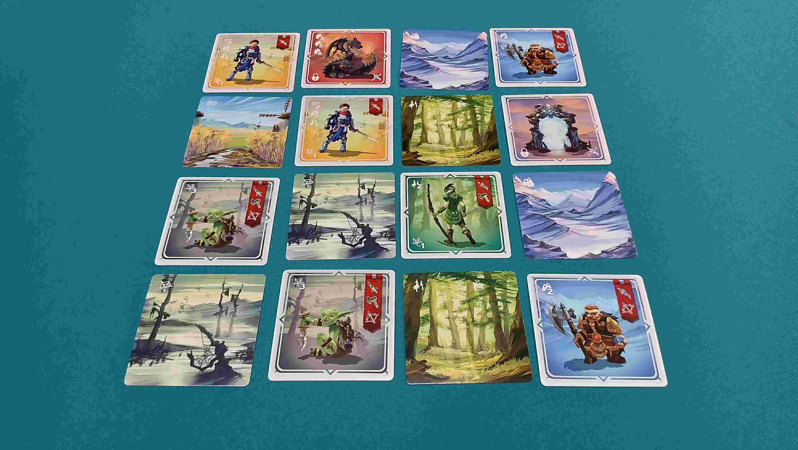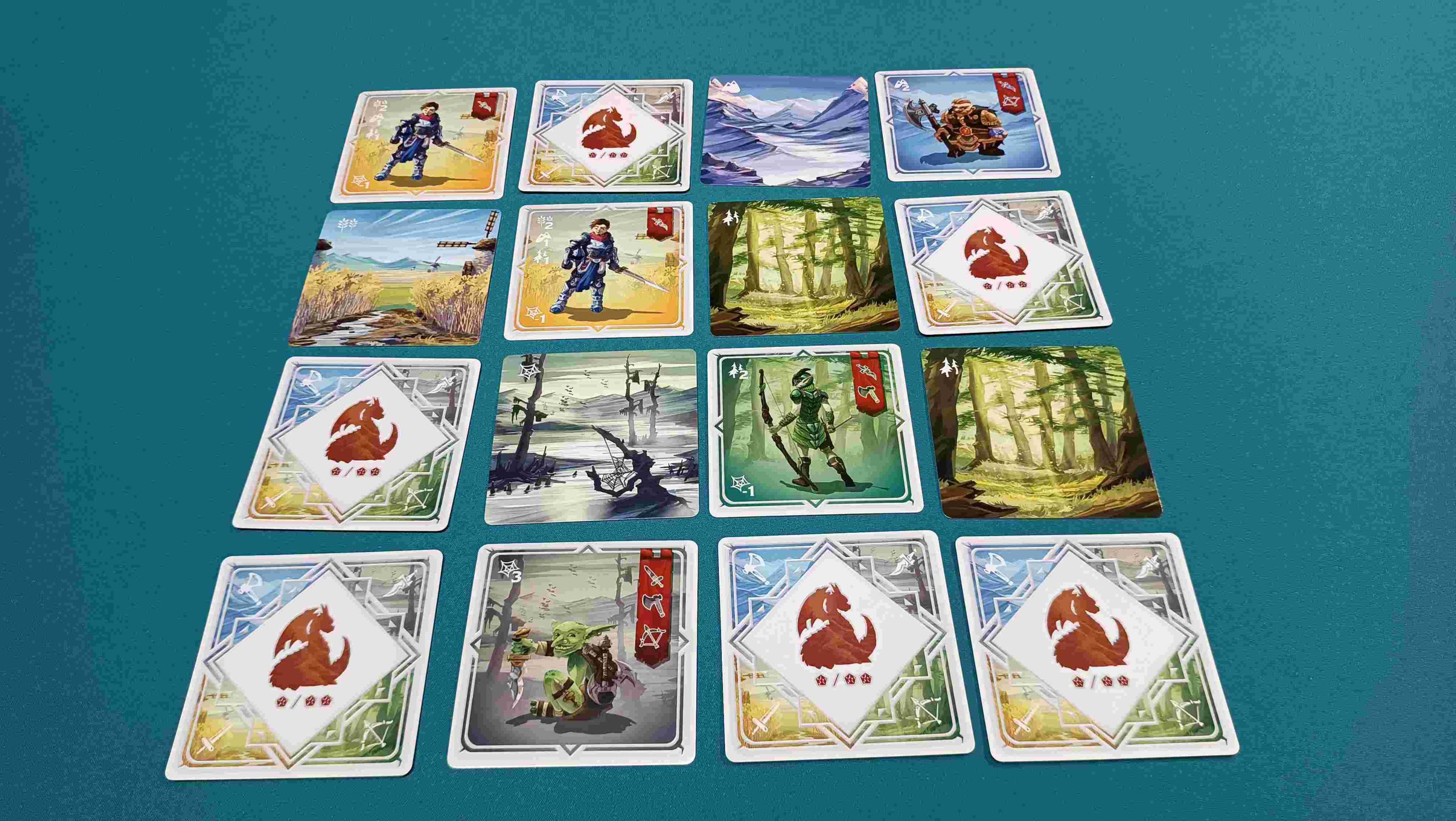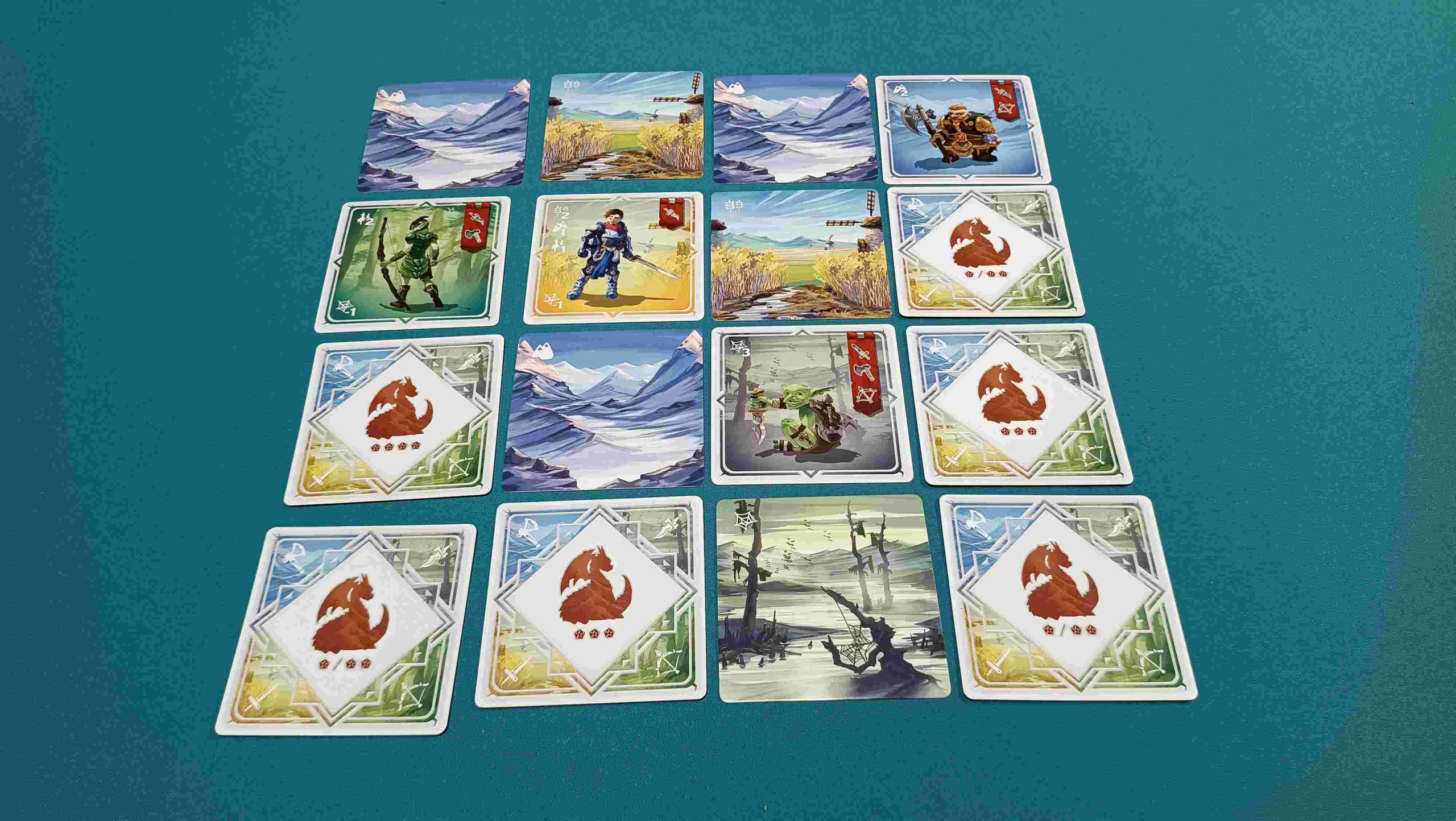 La preparación de la partida es muy sencilla. Cada jugador simplemente tiene que preparar su reino cogiendo 4 cartas y poniéndolas, bocarriba, formando una cuadrícula de 2×2 evitando que sean iguales y, a continuación, coge otras 12 y las coloca bocabajo alrededor de las primeras 4, formando con todas ellas una cuadrícula de 4×4.