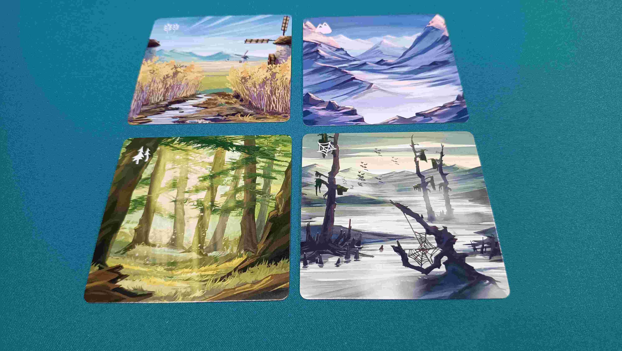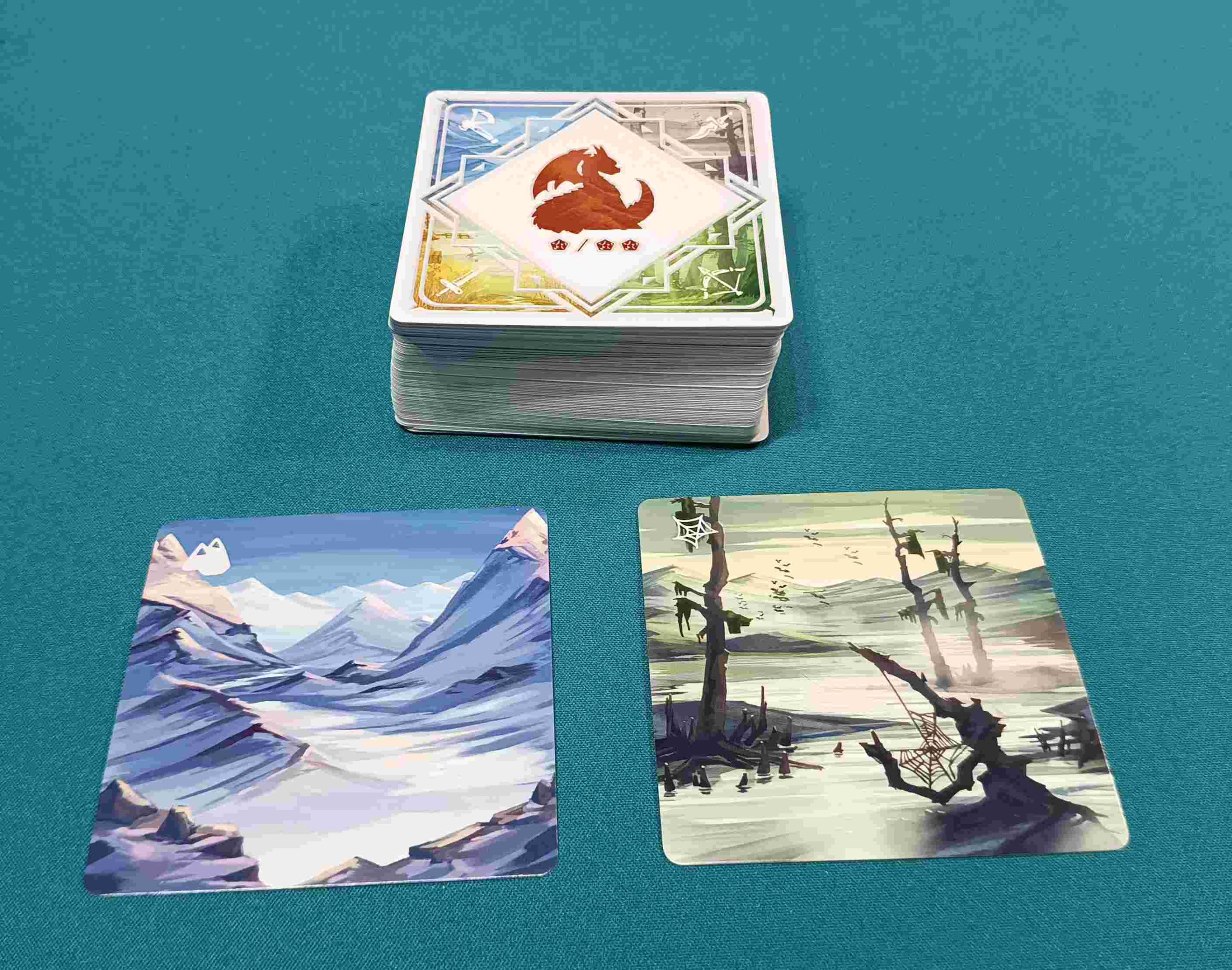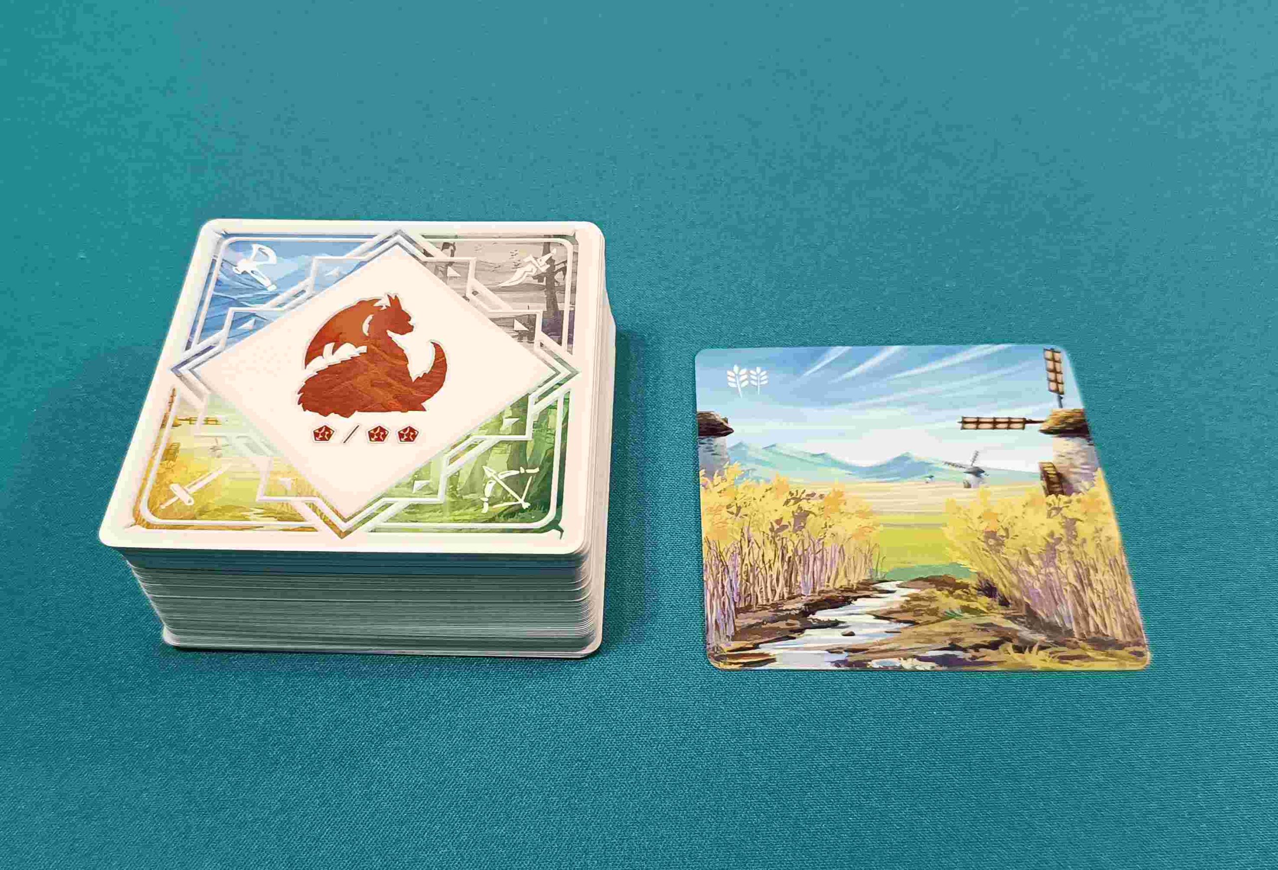 Por otro lado, es gracias al modo avanzado, que se incluye en el juego, y en el que, en cada carta de tierra salvaje que coloquemos al inicio de la partida, colocaremos al azar una loseta que iremos descubriendo a medida que vamos desvelando la carta. Lo interesante de este modo es que añade una capa más de profundidad al juego ya que estas losetas permitirán a los jugadores hacer diferentes acciones pero tendrán que decidir si se la quedan o no antes de revelarla.