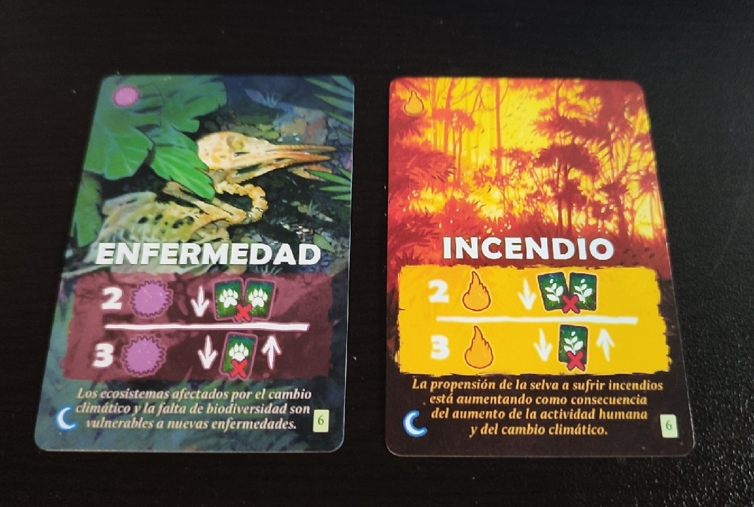 - Peligros: En función del número de cartas de incendio (afectan a las cartas de flora) o enfermedad (afectan a las cartas de fauna) que posea el jugador podrán pasar las siguientes cosas: