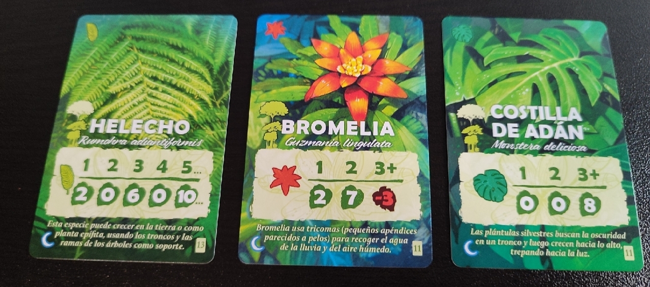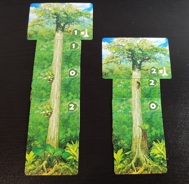 Se añade una ficha de animal para indicar que dicho árbol ya ha sido puntuado durante una ronda. Además, el jugador que tenga el árbol más alto se llevará la ficha de premio correspondiente de la ronda actual. - Plantas y tiempo: Se puntúan tanto las cartas de planta como las cartas de tiempo en función de sus condiciones y especificaciones.