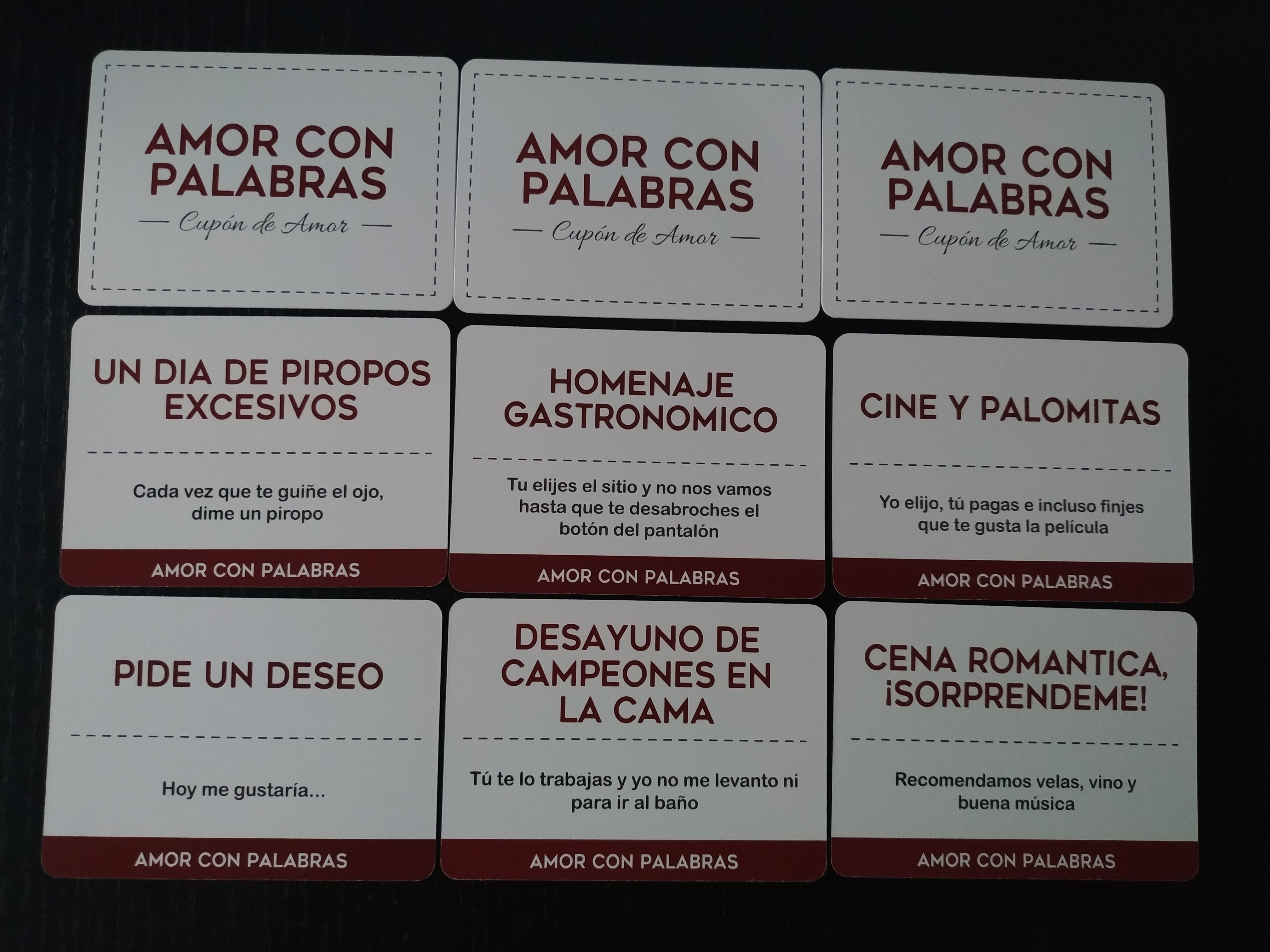 Nos ha parecido una buena idea incluir en la caja de Amor con palabras: Parejas los cupones especiales que pueden ser canjeados después de haber jugado. Eso aumenta la diversión y permite seguir dando utilidad al juego fuera del rato en que te sientas a jugarlo, continuar con la complicidad y seguir mejorando la relación y profundizando haciendo las actividades o canjeando los favores que éstos nos proponen.