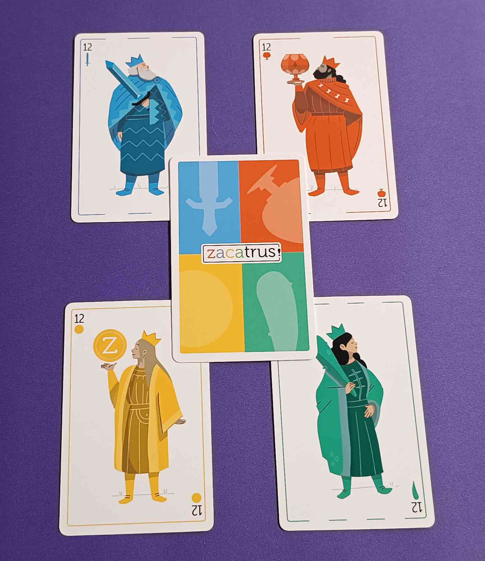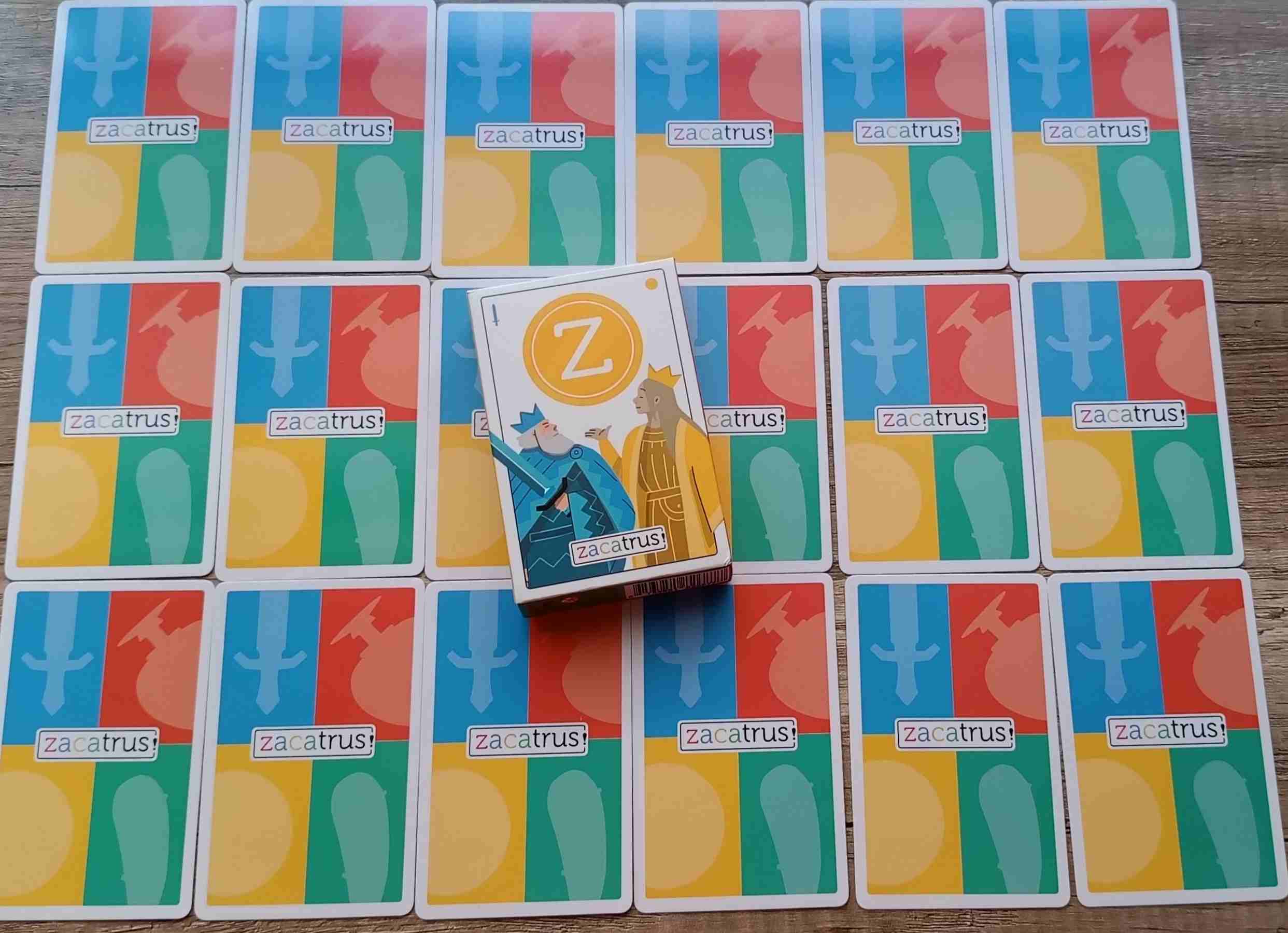 Además, el reverso es muy bonito y es de las cosas que más nos ha gustado ya que es una ilustración que divide la carta en cuatro sectores. En cada uno de estos sectores aparecen representados cada uno de los palos por su color y su símbolo. Y, en medio, la palabra Zacatrus. Una genialidad.