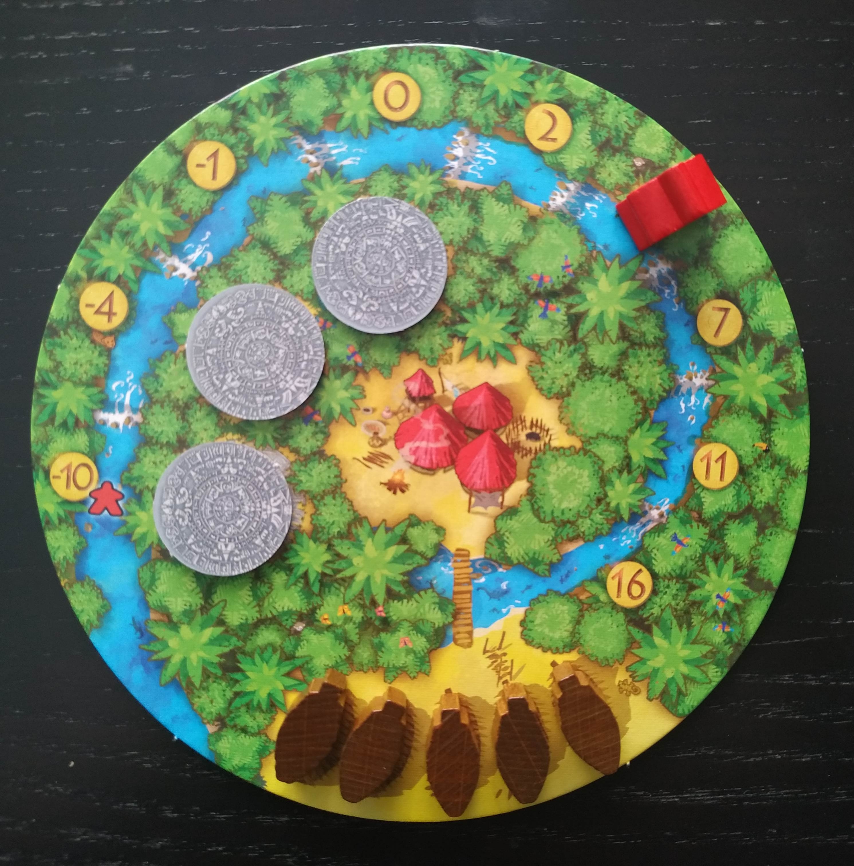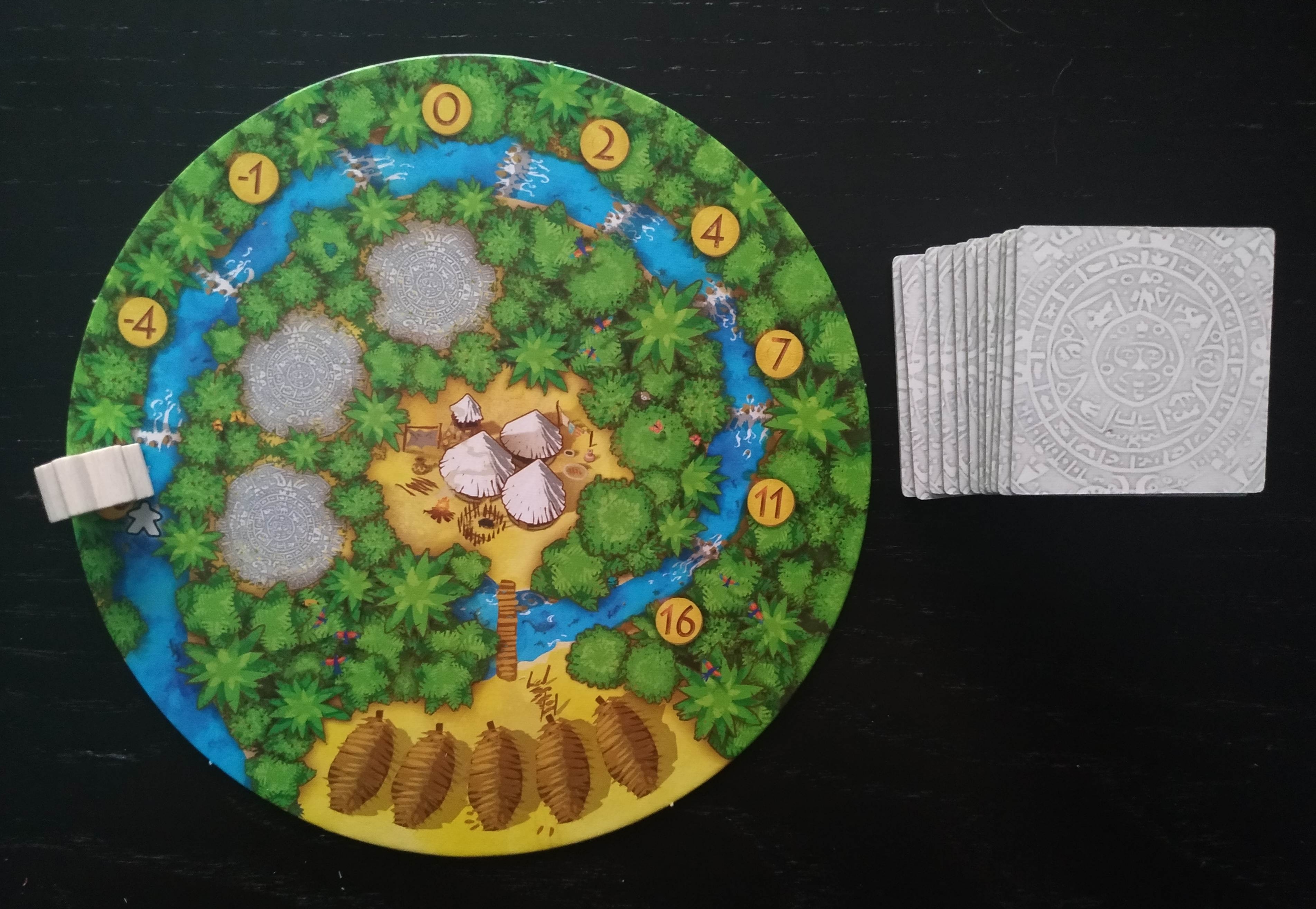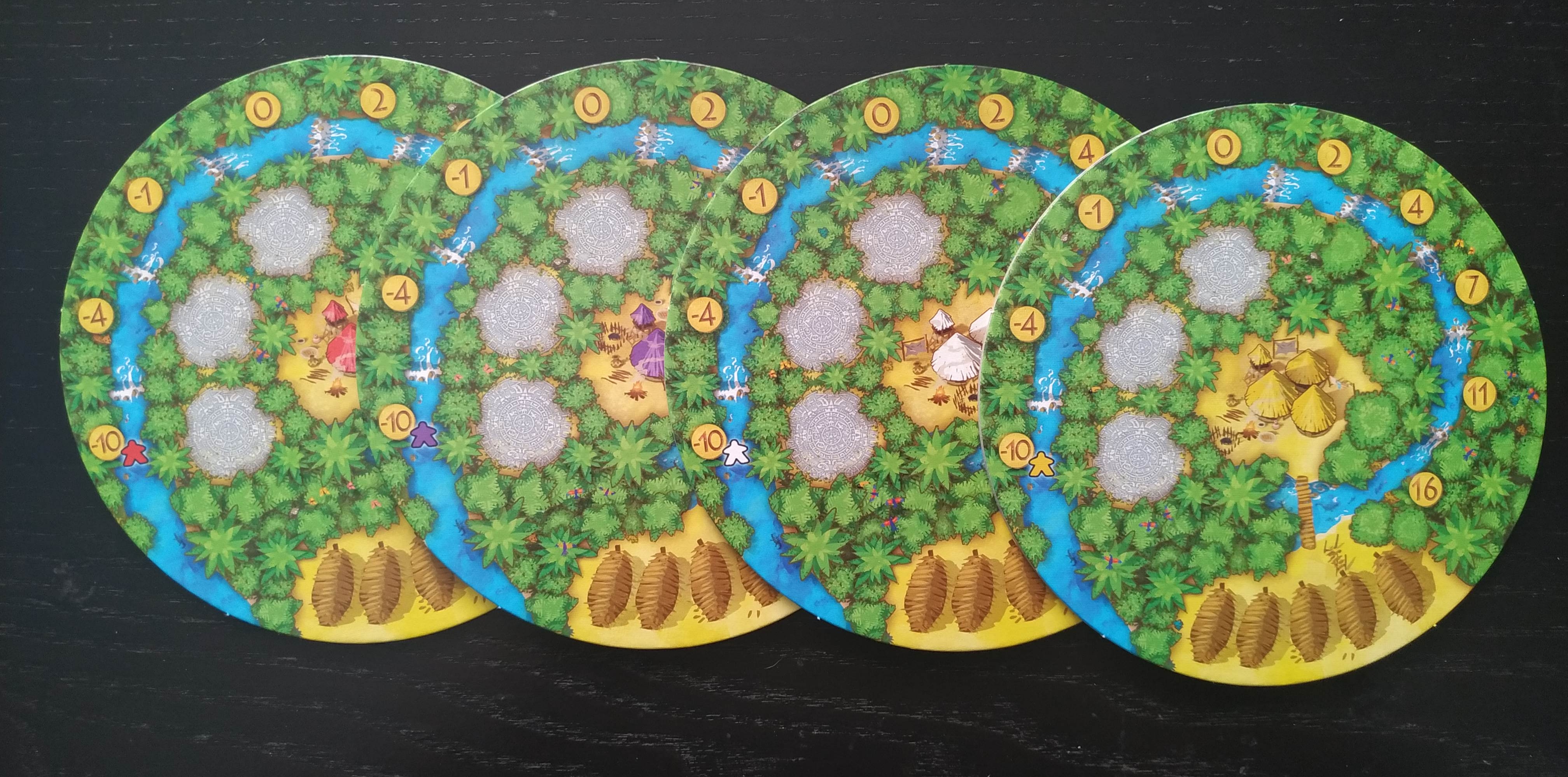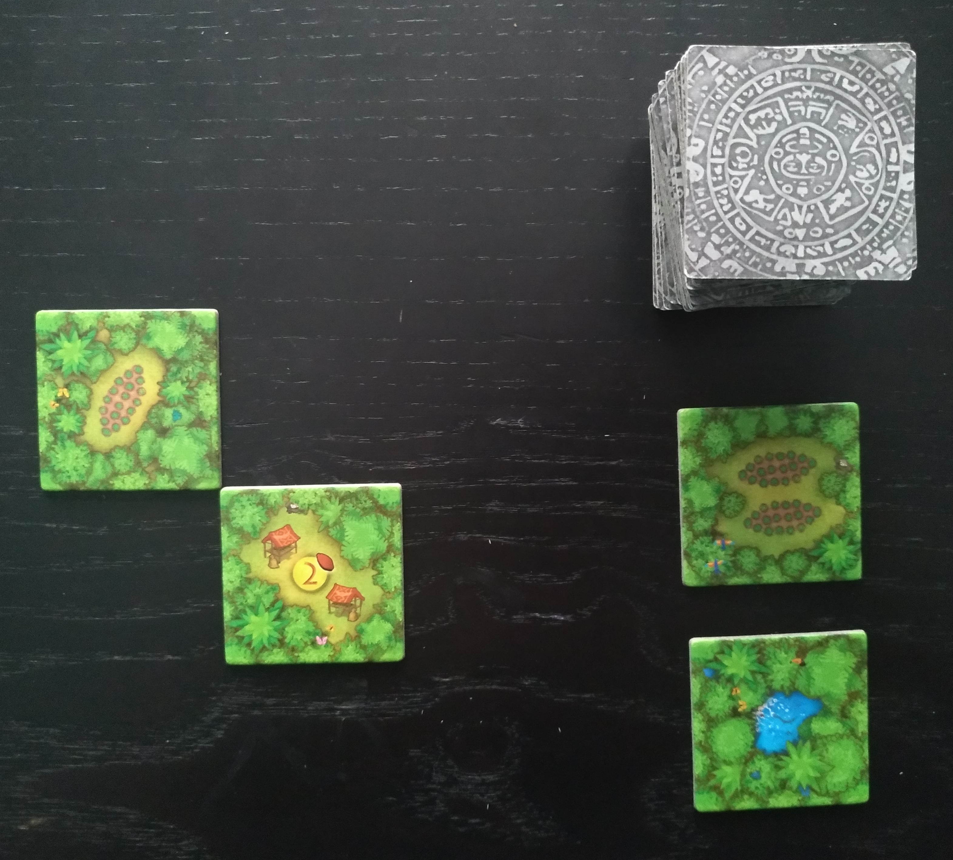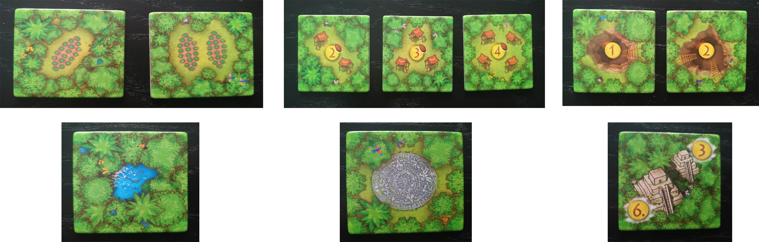 Tenemos 6 tipos de losetas de selva diferentes (Plantación de cacao, mercado, mina de oro, cenote, centro de culto solar y templo) que deberemos ir aprovechando cuando estén disponibles para, de forma equilibrada o no, todo depende de cómo vayamos maquinando nuestra estrategia individual, sacarles la máxima rentabilidad. Por ejemplo, no debemos olvidarnos de que tendremos a nuestro aguador en un espacio de puntuación negativa, empezando en -10 por lo que es importante no desaprovechar la oportunidad de colocar recolectores adyacentes a losetas de cenote para poder hacerlo avanzar y, al menos, conseguir que no nos reporte puntos negativos al hacer el recuento final.