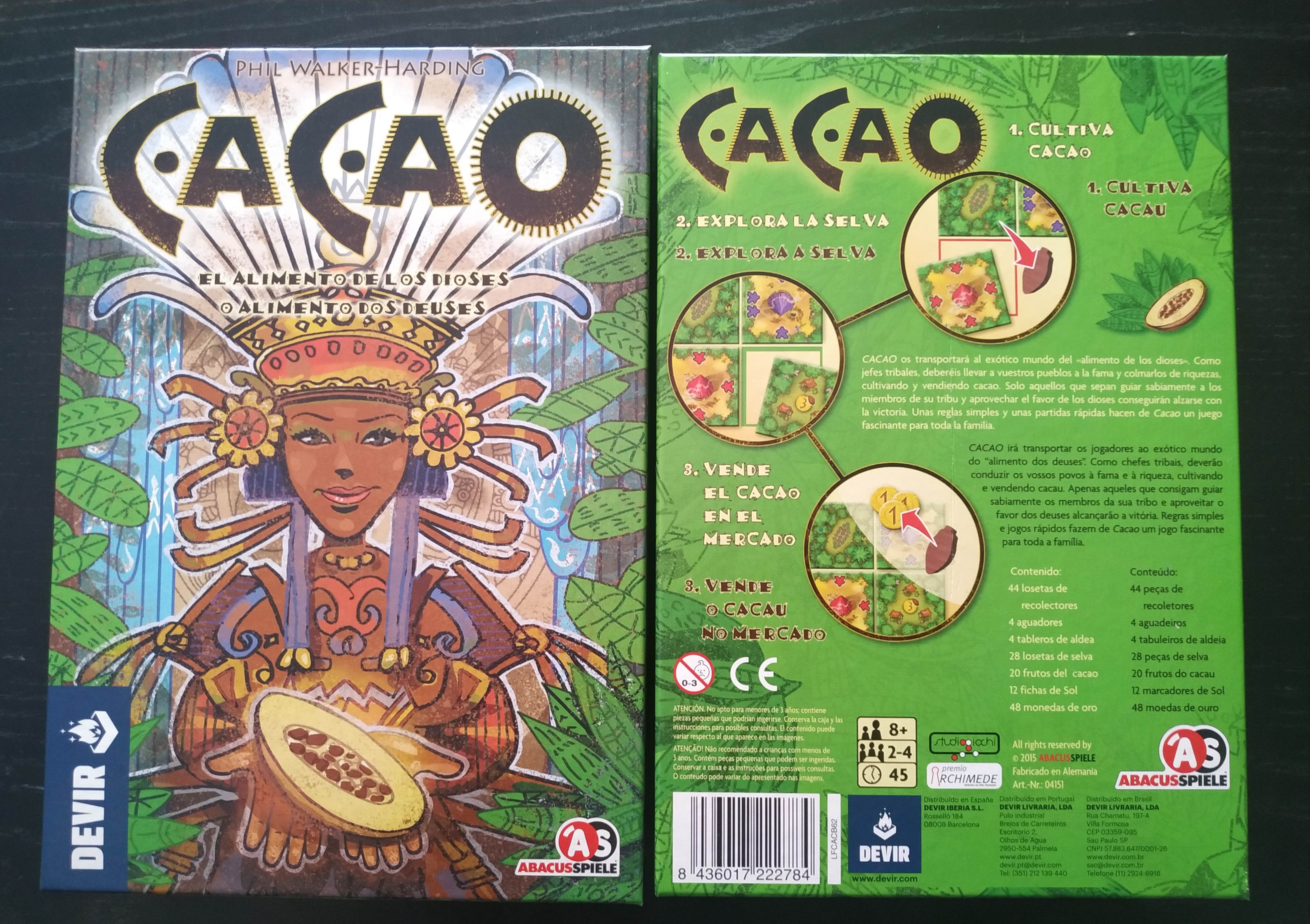 Cacao os transportará al exótico mundo del «alimento de los dioses«. Como jefes tribales, deberéis llevar a vuestros pueblos a la fama y colmarlos de riquezas, cultivando y vendiendo cacao. Solo aquellos que sepan guiar sabiamente a los miembros de su tribu y aprovechar el favor de los dioses conseguirán alzarse con la victoria. Unas reglas simples y unas partidas rápidas hacen de Cacao un juego fascinante para toda la familia.