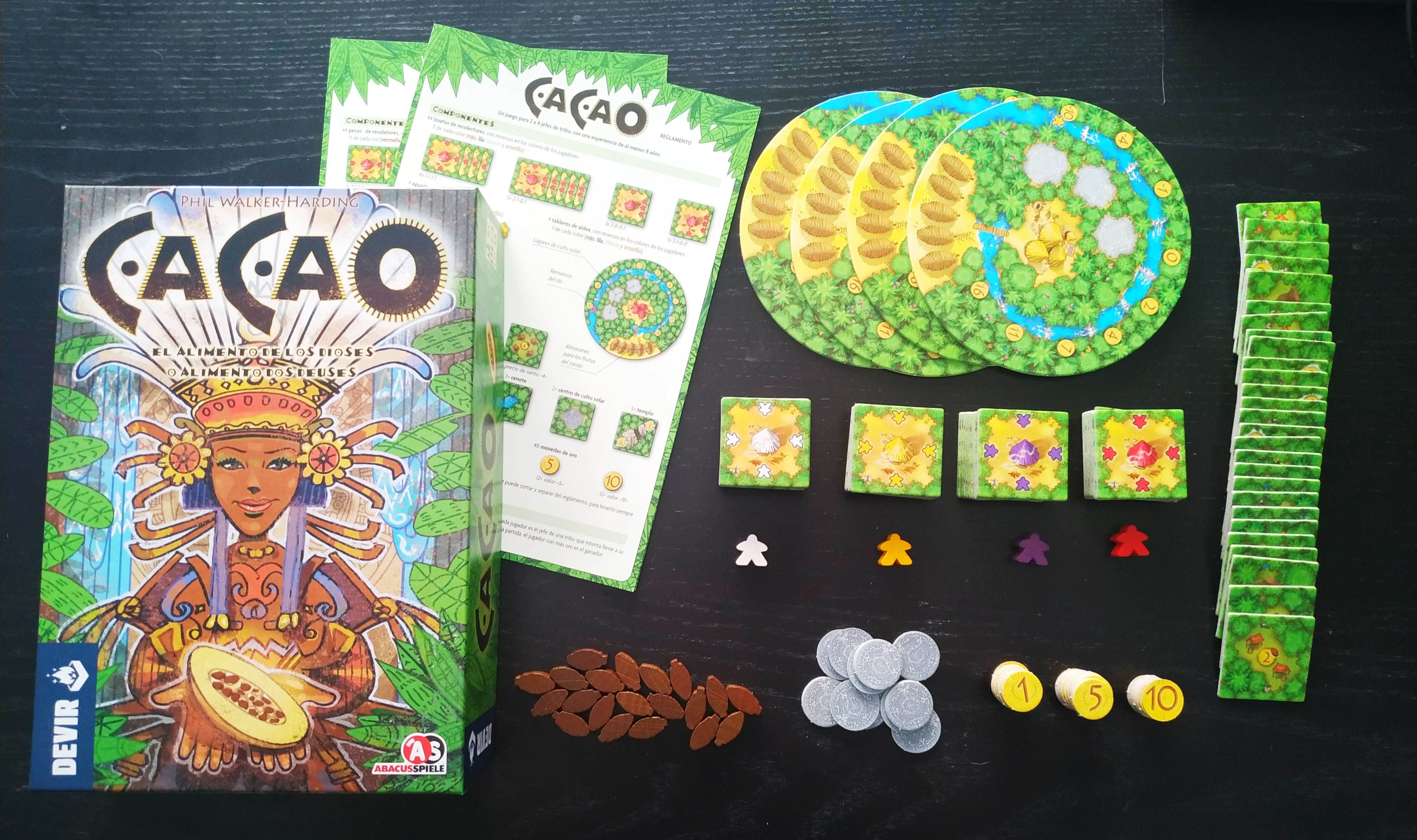 En Cacao cada jugador se convertirá en el jefe de una tribu con el objetivo de producir cacao y poderlo vender. Durante la partida también deberemos explorar diferentes lugares para aumentar nuestra riqueza.