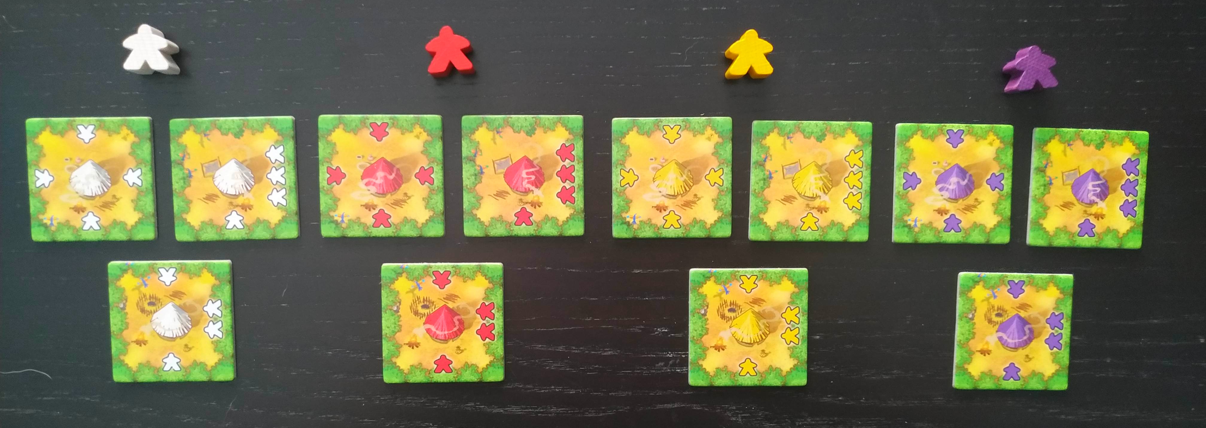 En ellas encontramos una zona de terreno con una cabaña en el centro del color del jugador al que corresponde. Su reverso será también de dicho color. En cada uno de sus márgenes veremos una serie de meeples del color del jugador que siempre sumarán cuatro y nos servirán para activar las losetas adyacentes.