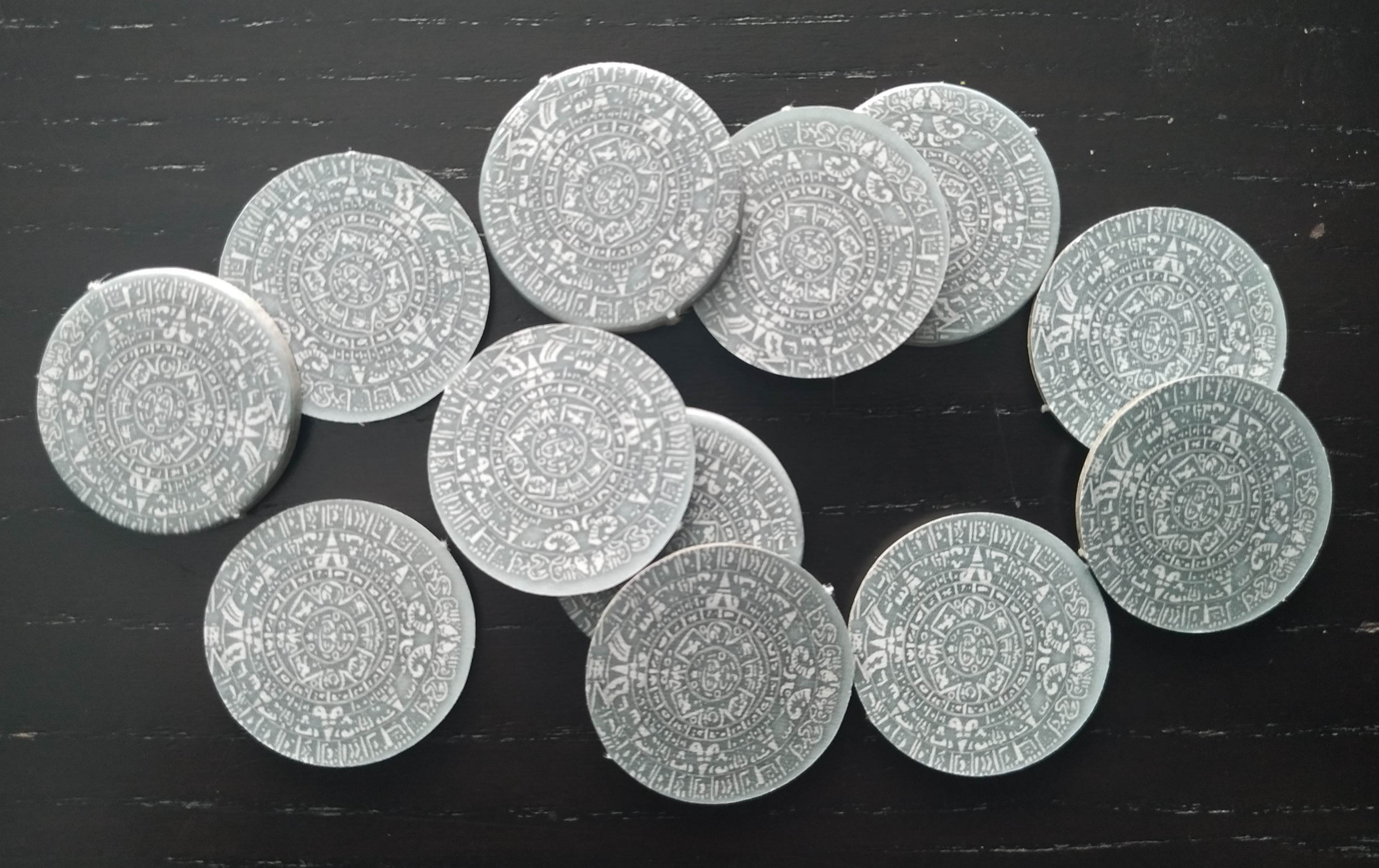 Dejaremos las monedas, las piedras solares y las fichas de cacao en montones diferenciados pero al alcance de todos.