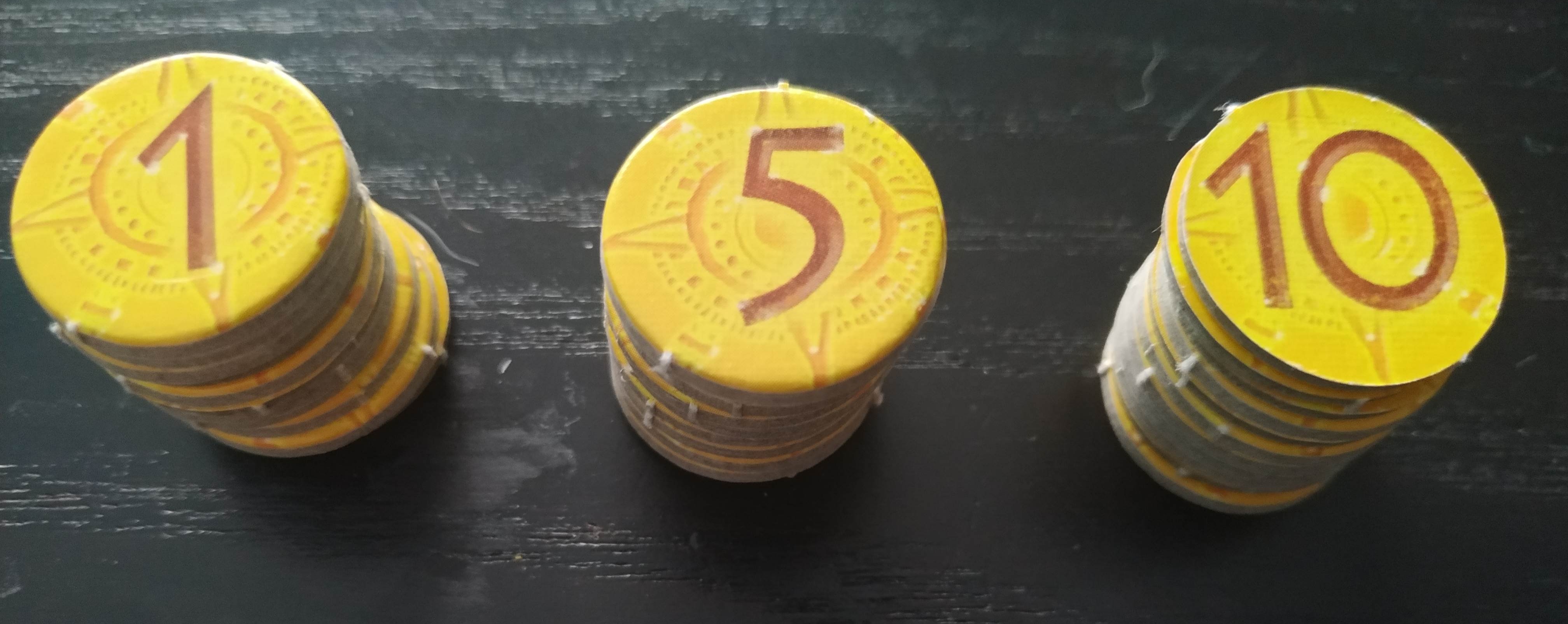 Las iremos acumulando durante la partida o al final de la partida y son las que nos otorgarán puntos de victoria. Las tenemos de valor 1, 5 y 10.