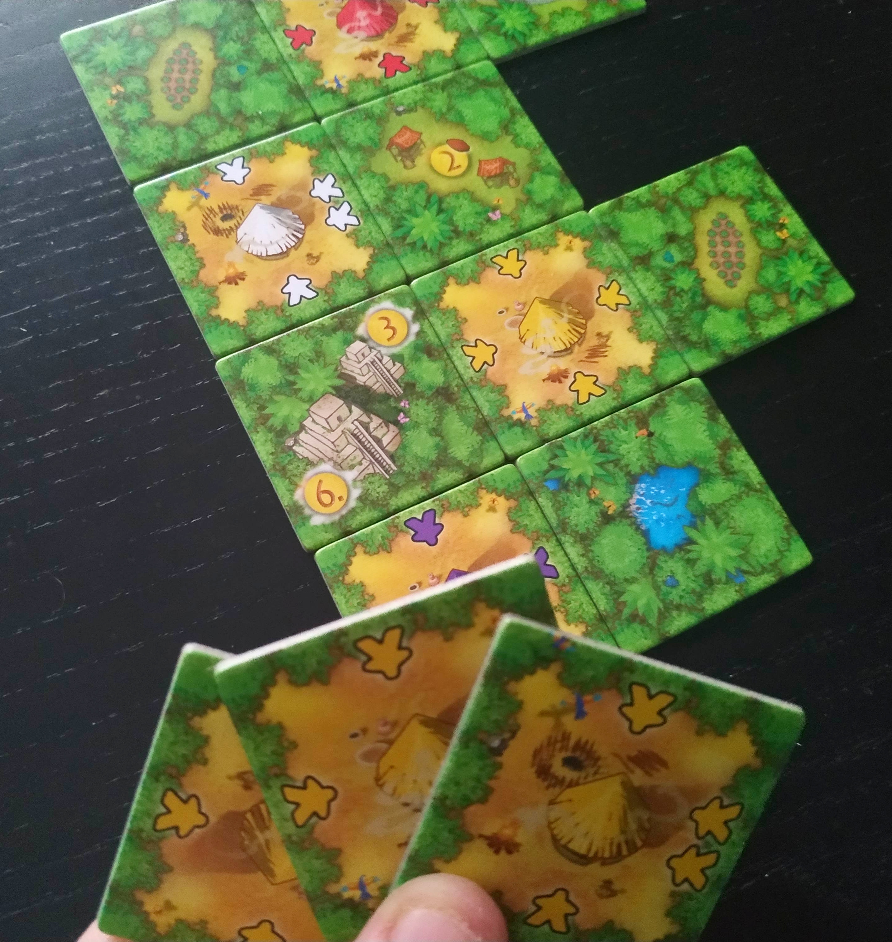 - Colocar una loseta de recolectores: Elegiremos una de las losetas de nuestra mano y la colocaremos adyacente a alguna de las losetas de selva existentes en la zona de juego, siguiendo las reglas. Podremos orientarla como queramos.