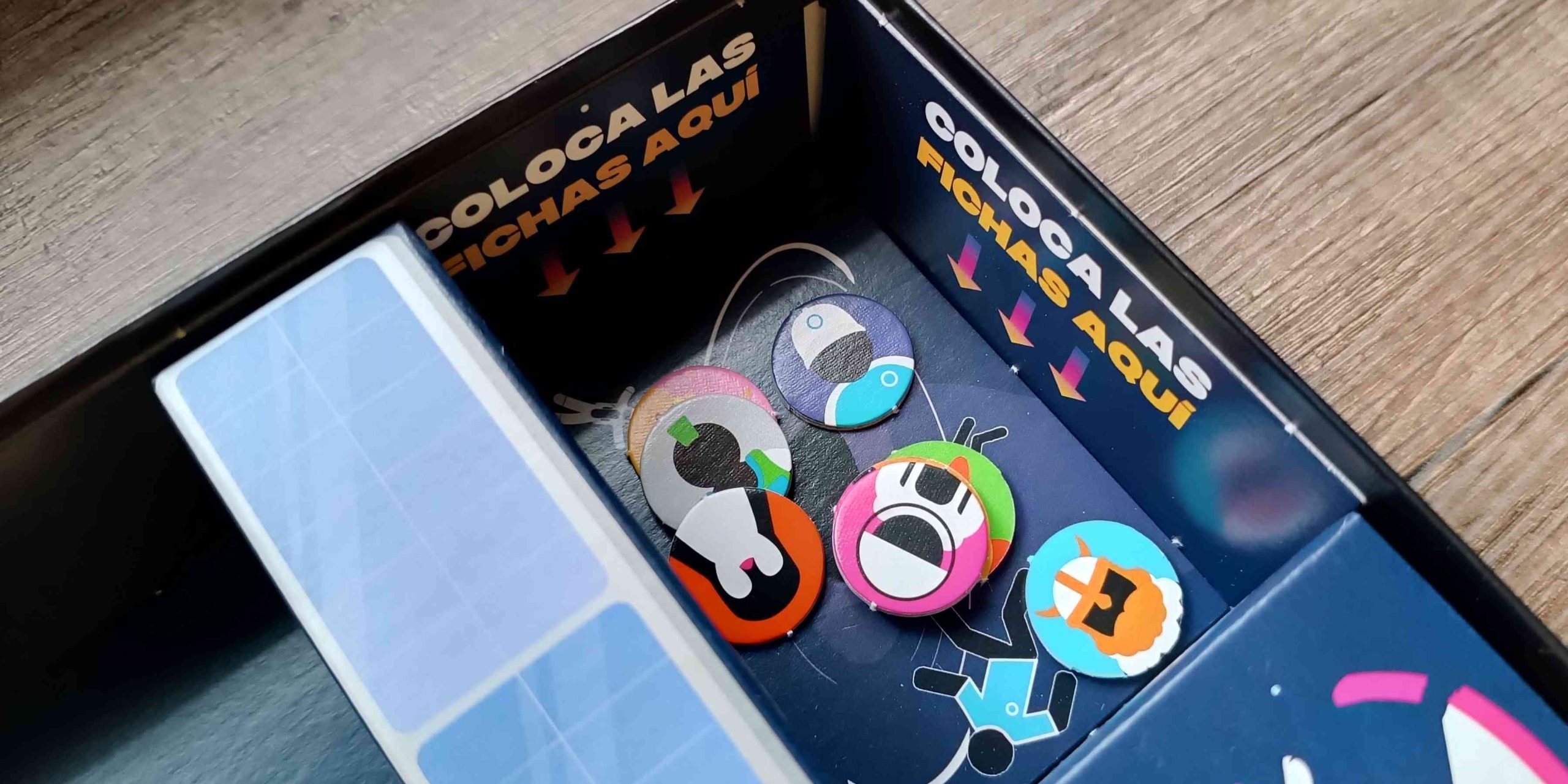 Encontraremos muchas cartas en el interior que nos darán diversión para rato. Todas ellas vienen con texto de buen tamaño, adecuado para poderse leer fácilmente y divididas en seis divertidas categorías. Además, encontraremos las fichas de personaje que cada jugador deberá elegir para que le representen en su viaje por el tablero de puntos mientras jugamos.