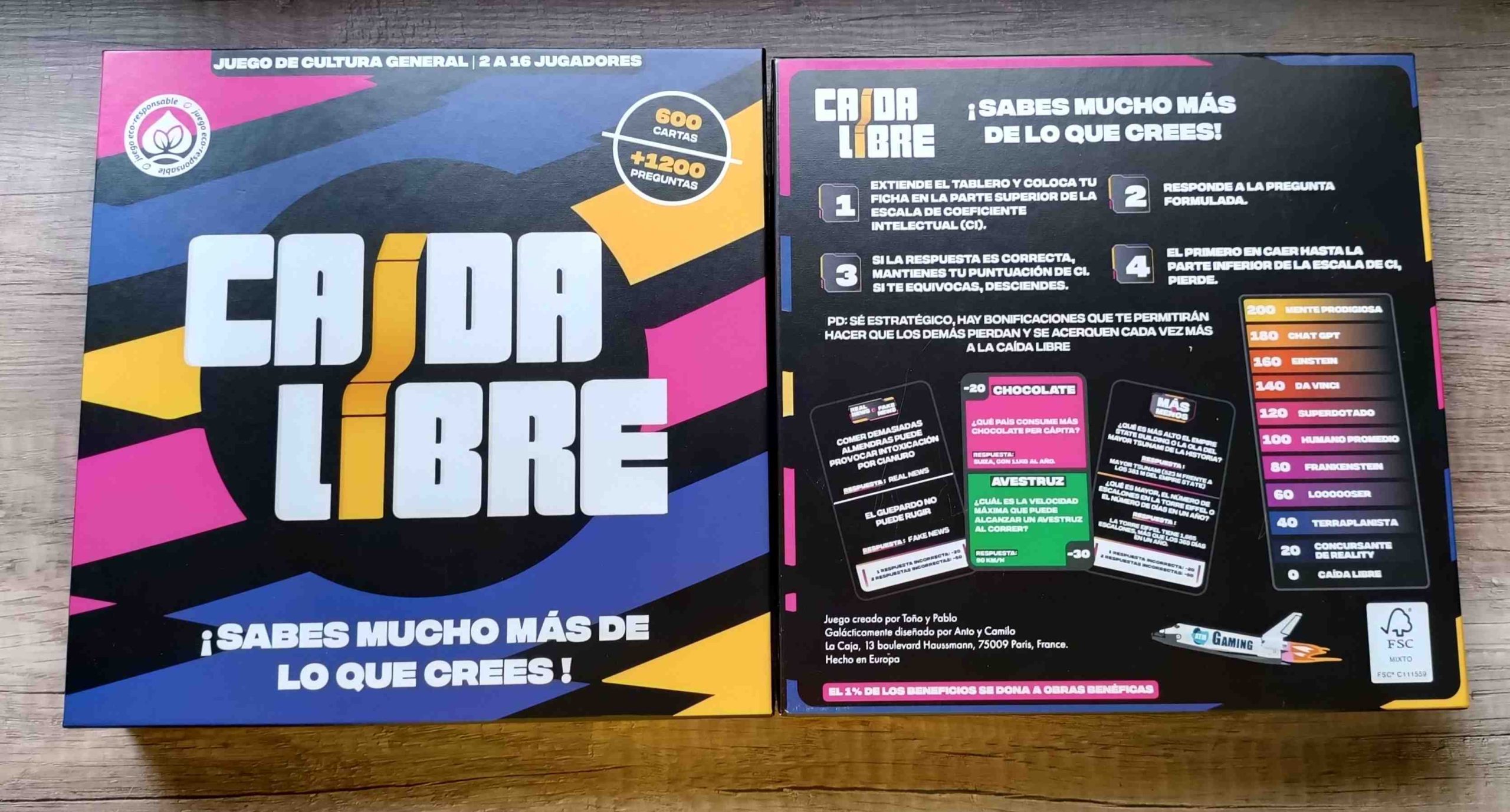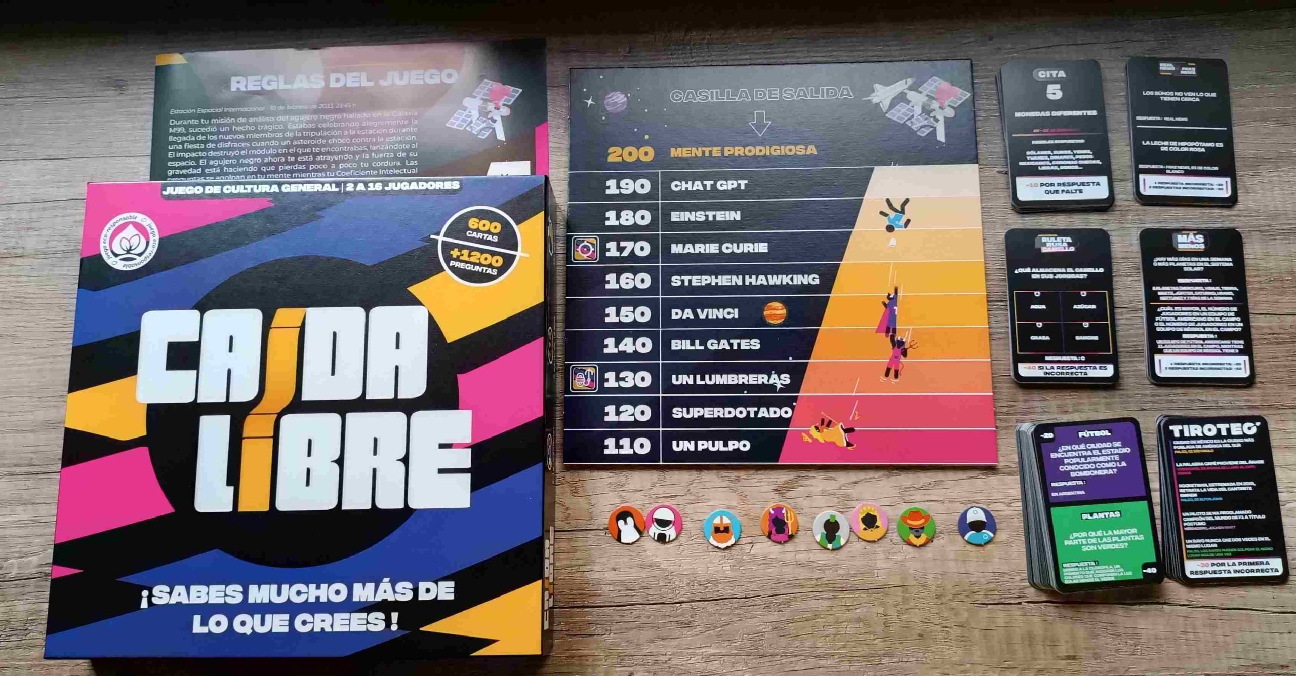 Por concluir, decir que Caída libre es un party en el que tendremos que perdiendo coeficiente intelectual por el abismo de un tablero que nos irá marcando de una manera divertida la categoría de persona a la que pertenecemos. Es genial tanto para grupos pequeños como si lo jugamos muchos y tendremos la sensación de estar jugando al clásico trivial pero más moderno y con unos puntos diferentes que le sientan muy bien.