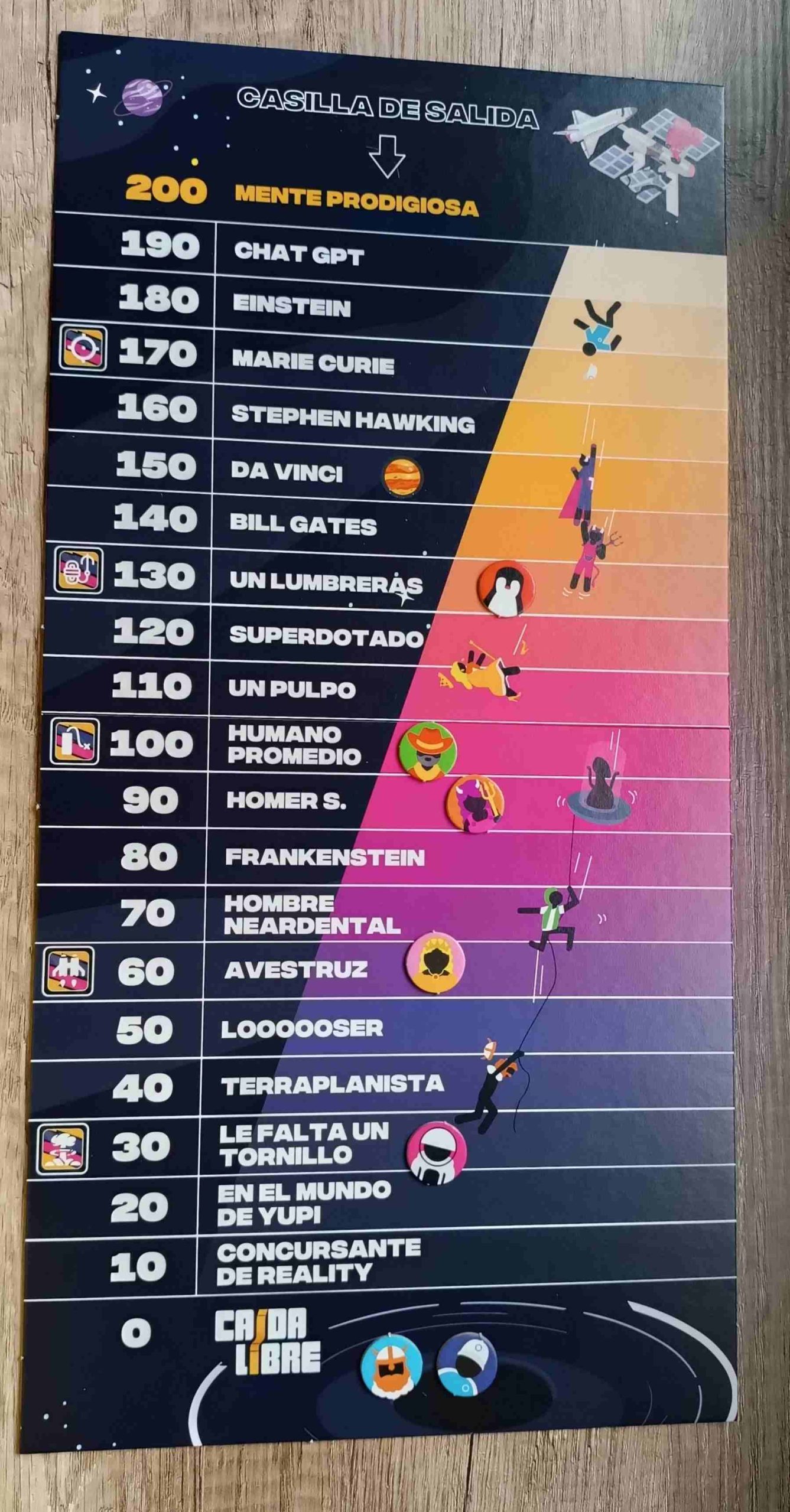 - El armageddon: Si respondemos correctamente, sumaremos 10 puntos de CI adicionales y todos los demás jugadores se restarán 20 puntos. Si fallamos, solo perderemos los puntos que indique la tarjeta.