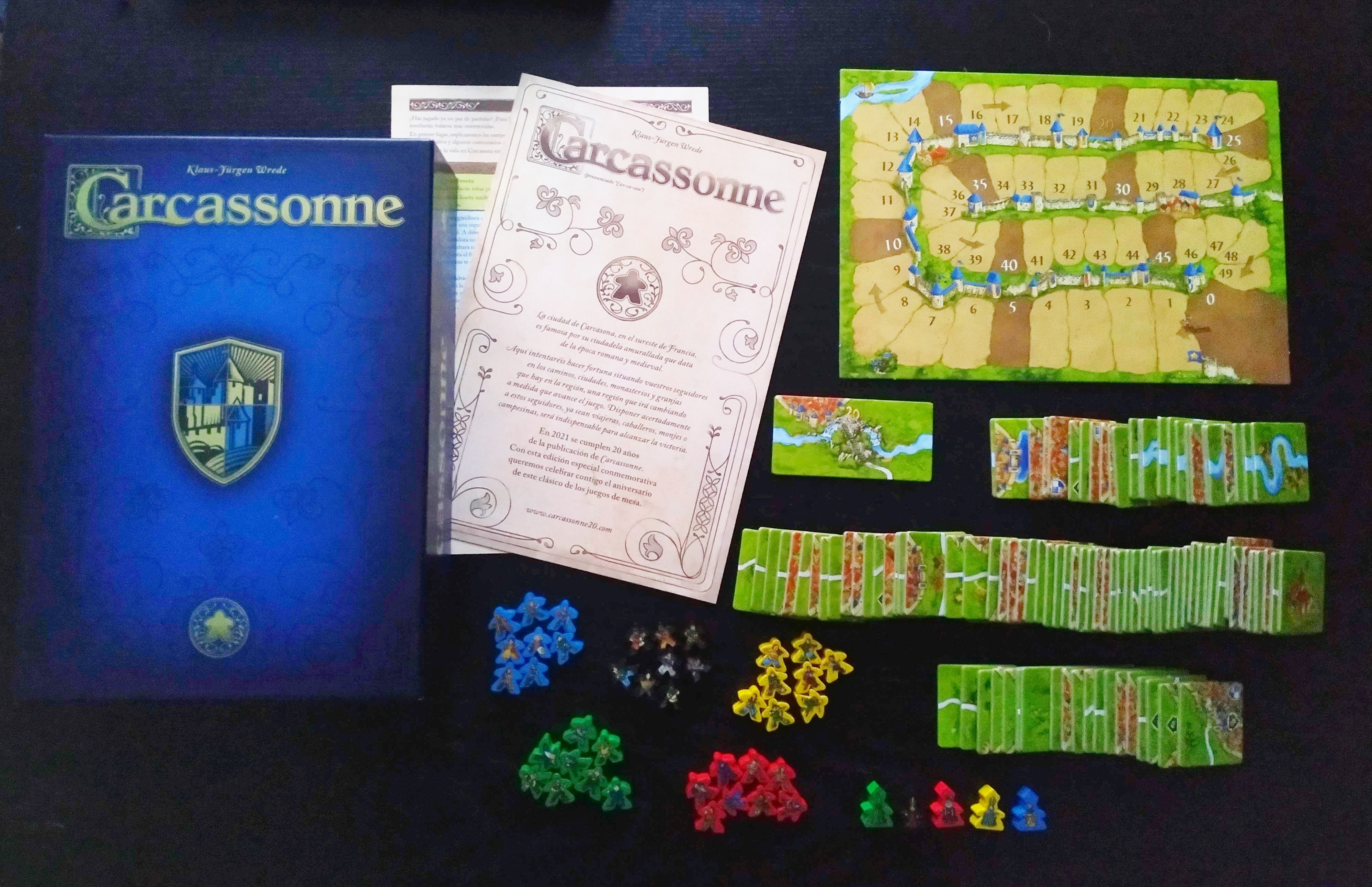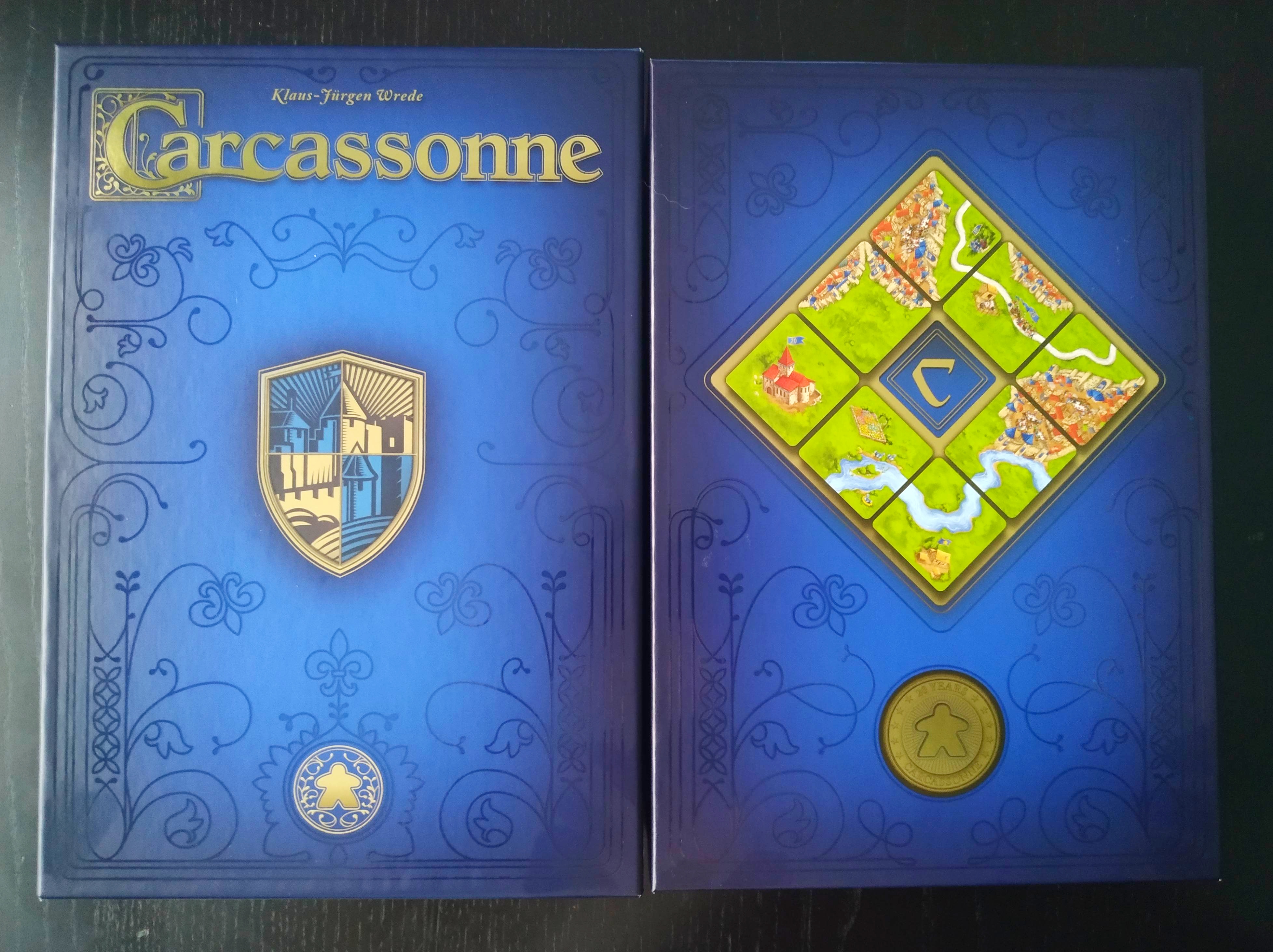 Se trata de una edición especial, totalmente independiente del juego básico, que conmemora su 20º aniversario y que incluye muchas mejoras estéticas, algunas mini expansiones conocidas y mejoradas, una mini expansión totalmente exclusiva de la edición, con meeples personalizables y un montón de detalles en las losetas que están a la altura del vigésimo aniversario de un juego como Carcassonne.