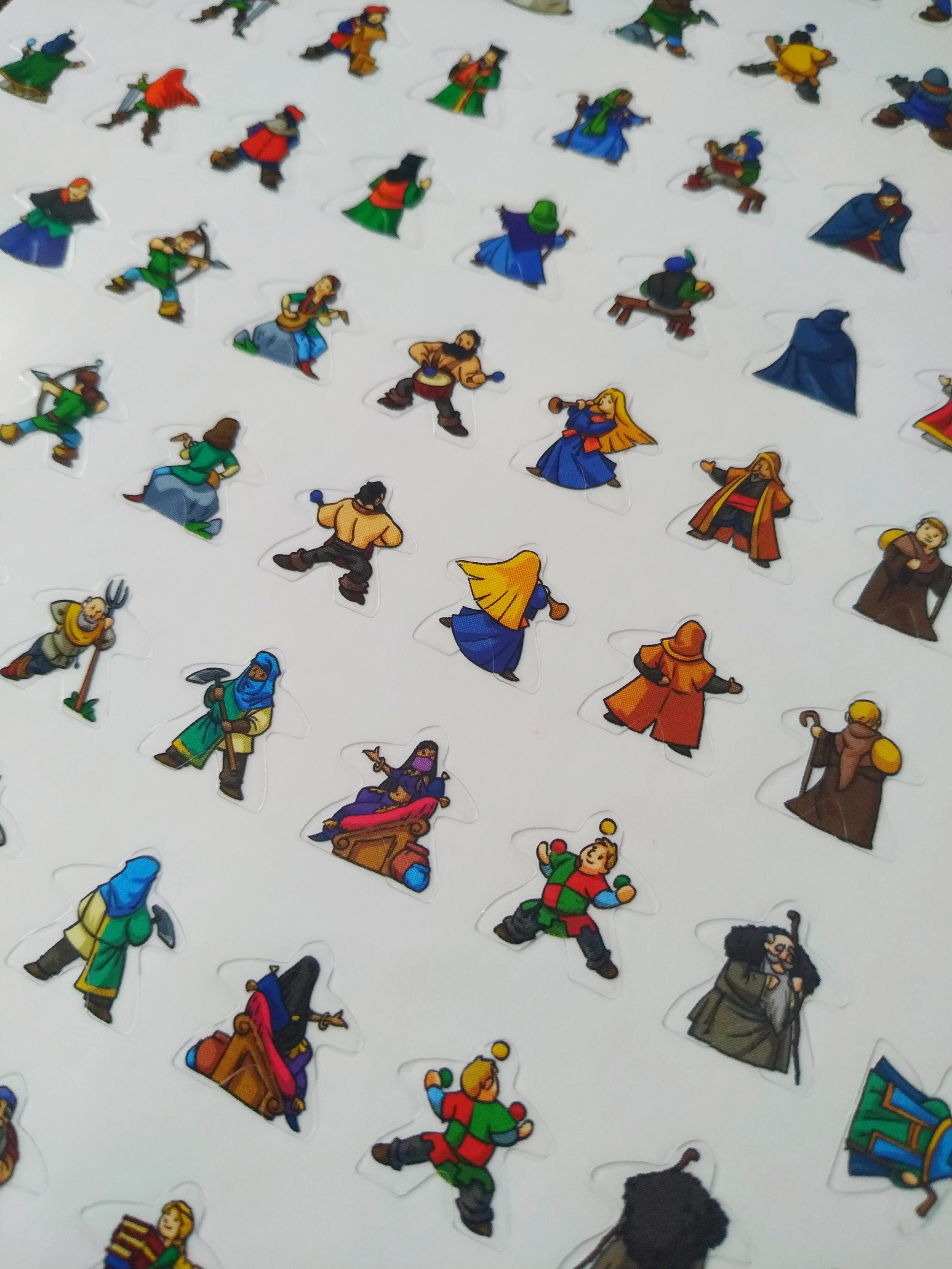 Otro cambio estético, y que es opcional, pero que para nuestro gusto queda espectacularmente bien, son las pegatinas para poner a los meeples que incorpora. Como decimos, es un elemento que puedes no colocarlo sino quieres, pero merece mucho la pena porque el cambio se hace notar. Cada meeple cuenta con dos pegatinas, una para la cara delantera y otra para la cara trasera y que representan diferentes personas, cada una haciendo una cosa y con colores variopintos. Es decir, salvo por los abades, cualquier pegatina vale para cualquier meeple para poder decorarlos a nuestro gusto.
