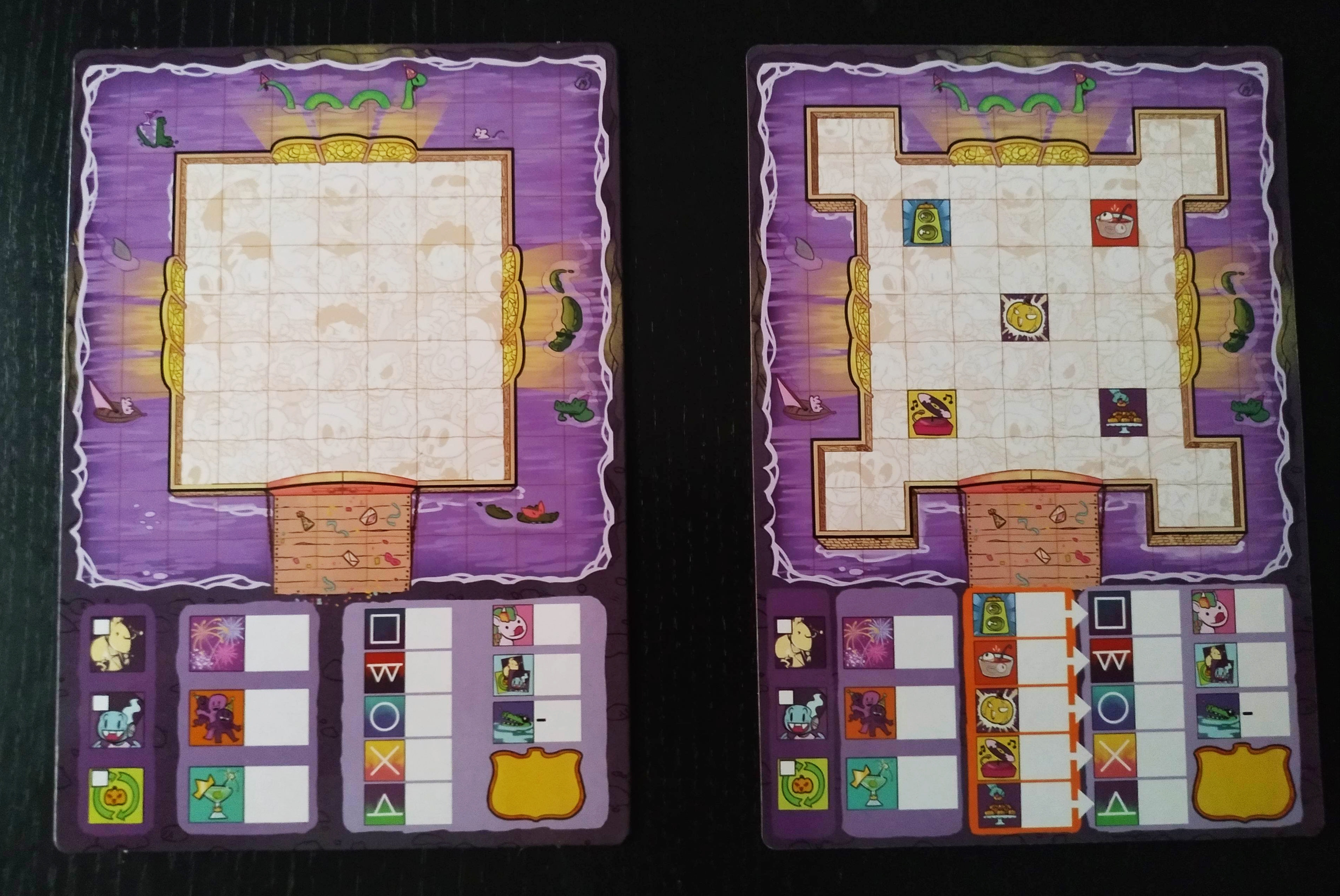Con ya sabemos, el juego va de ir colocando a nuestros invitados por el castillo a medida que vayan llegando a la fiesta. Para poder hacer esto, el juego cuenta con la mecánica «flip & write» que consiste en que entre los jugadores debemos ir jugando cartas de monstruos que tendremos en la mano para formar una figura y, una vez formada, deberemos dibujarla en nuestro castillo.