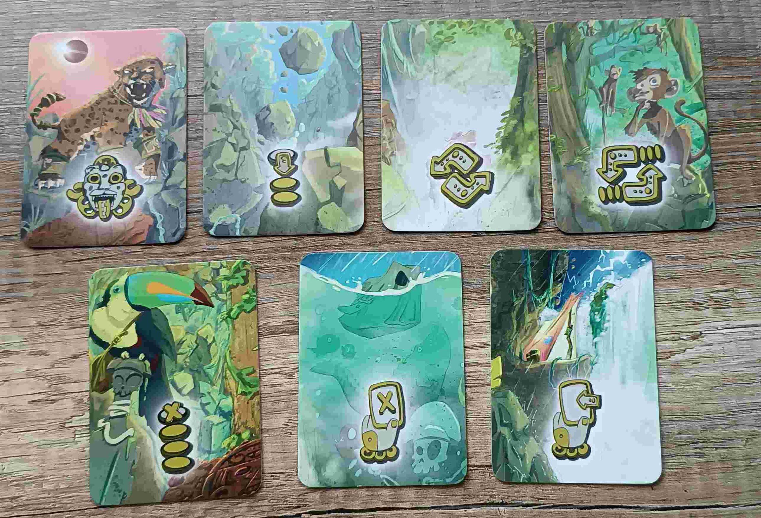 En el interior encontramos cartas de buen gramaje a todo color que nos muestran, mediante ilustraciones, diferentes escenas dentro de la selva, que nos iremos encontrando mientras vivimos nuestra aventura. La simbología es fácil de entender y no tienen texto en ellas.