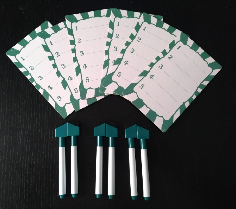 También tenemos las cartas, con marco rojo y los personajes en cada una de ellas y de buena calidad, el dado de madera personalizado con números morados y los componentes estrella que hemos dejado para el final: las pizarras y rotuladores verdes donde podremos escribir nuestras predicciones. ¡Ha sido todo un acierto incluirlas!