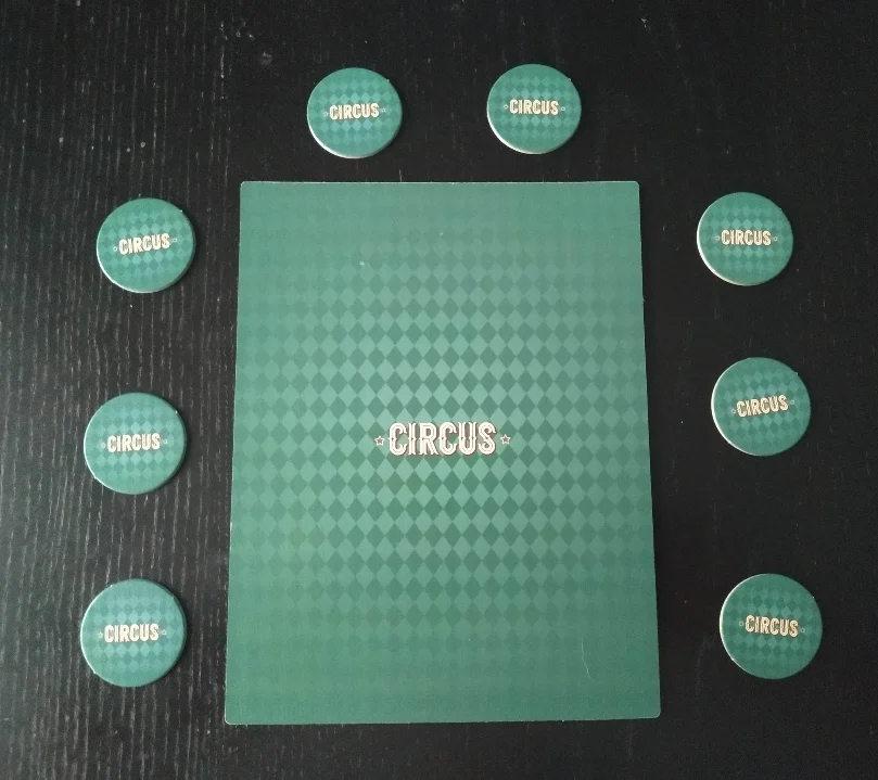 Por un lado tenemos un tablero grueso de bastante buena calidad donde se colocarán las fichas que «actuarán» durante esa partida. Dichas fichas son de color verde y por un lado tienen el nombre del juego pero por el otro nos presentan a todos los personajes de circo.