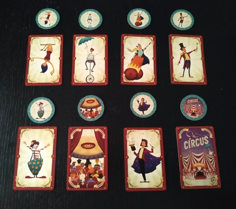 - Carpa: esta carta no tiene acción al jugarla pero es necesaria para poder cerrar Circus. Cuando tienes boca abajo frente a ti la combinación oculta de personajes, necesitarás una carta de carpa que dejarás sobre el mazo de descartes para terminar la partida. Debemos saber que la carta de carpa también puede ser uno de los personajes que estén en el tablero formando la combinación oculta. De ser así, deberemos tener dos cartas de carpa, una boca abajo frente a nosotros y la otra para poder cerrar el juego.
