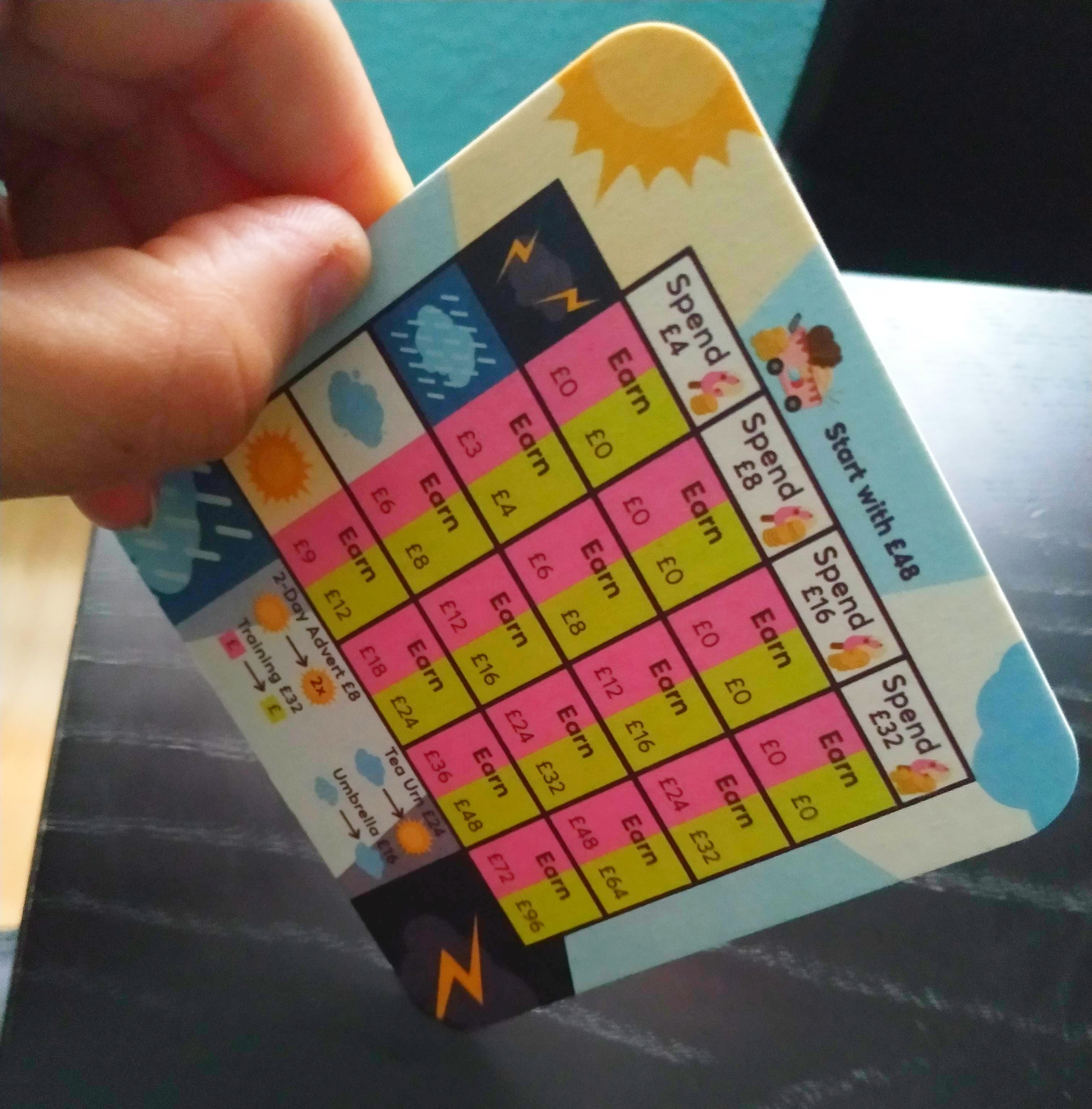 En cada ronda, tras anotar en nuestra hoja en qué queremos invertir, rotaremos a escondidas el posavasos para que, de manera aleatoria, al apoyarlo sobre una de sus esquinas en la mesa, aparezca uno de los símbolos de clima (sol, nubes, lluvia o tormenta) que será lo que marcará el dinero ganado por el número de helados vendidos.