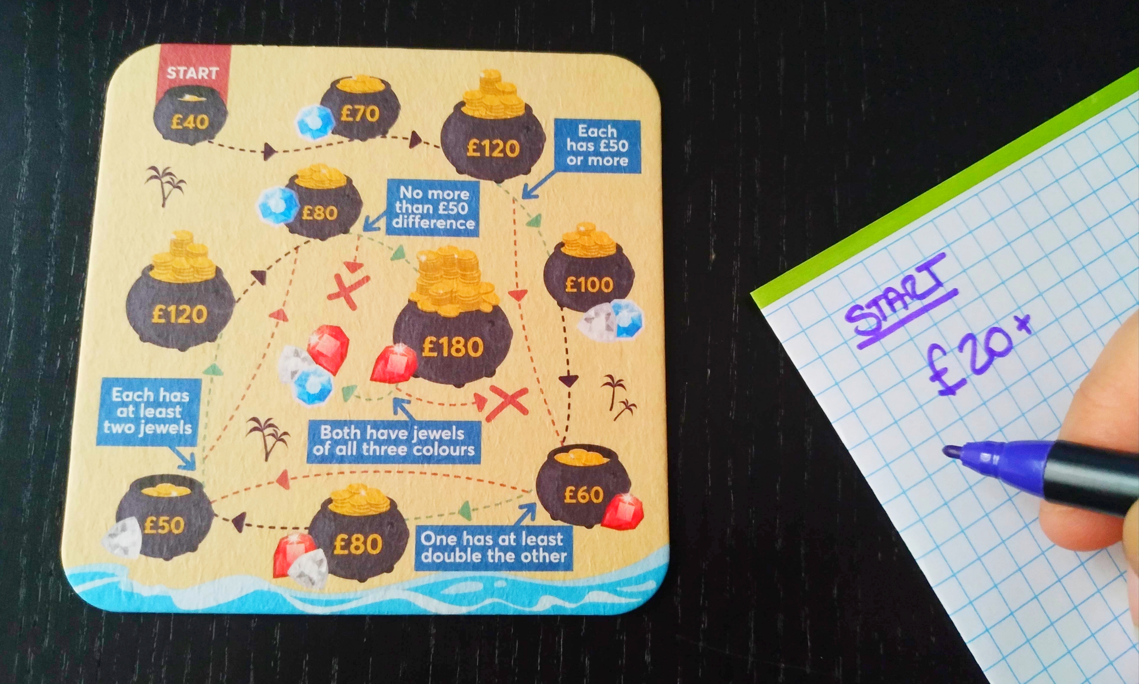 Un juego cooperativo para 2 jugadores en el que recorreremos un camino con ollas llenas de tesoros y de manera individual deberemos decidir si repartimos el botín o si nos lo quedamos entero para nosotros solos, decisión que hará que nuestro rumbo cambie según si coincidimos ambos en dicha elección. Deberemos obtener la mayor puntuación posible al final del recorrido.