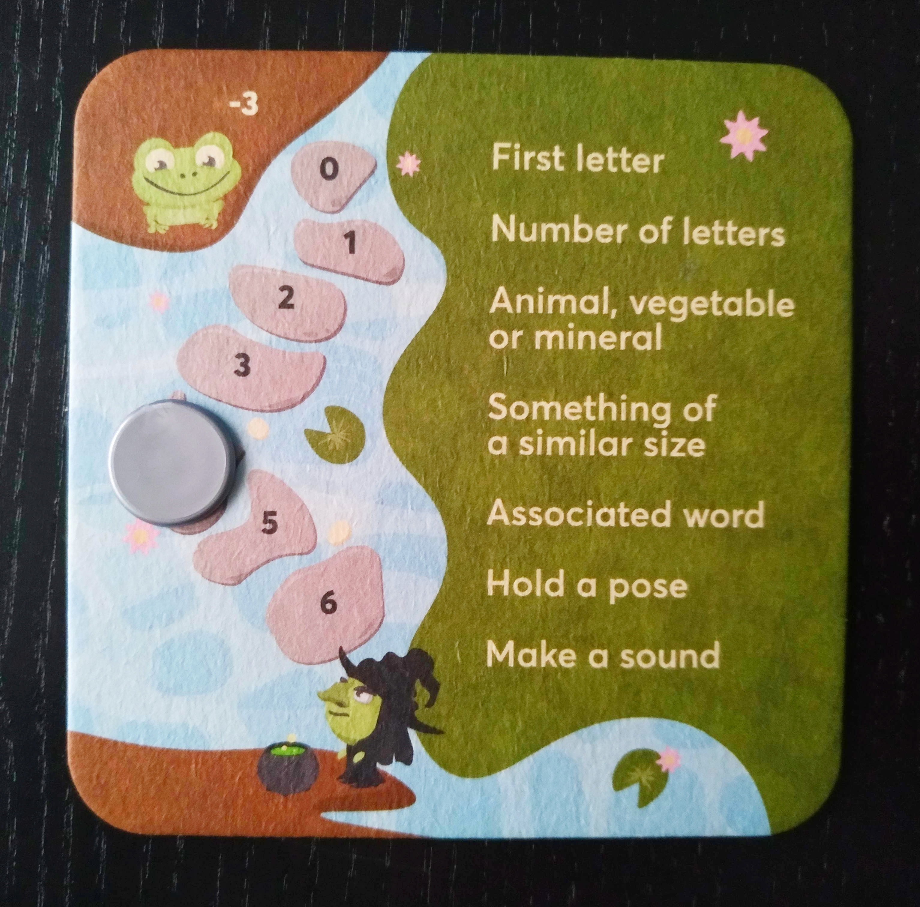 Empezaremos eligiendo quién será la rana en cada ronda. Al ser cooperativo iremos todos juntos para conseguir el objetivo. La rana deberá elegir en secreto una palabra, un nombre, que será la que rompa ese hechizo. La rana solamente podrá comunicarse cuando sus compañeros pregunten por pistas. Podemos ver el tipo de pistas a preguntar en un lateral de nuestro tablero de juego.
