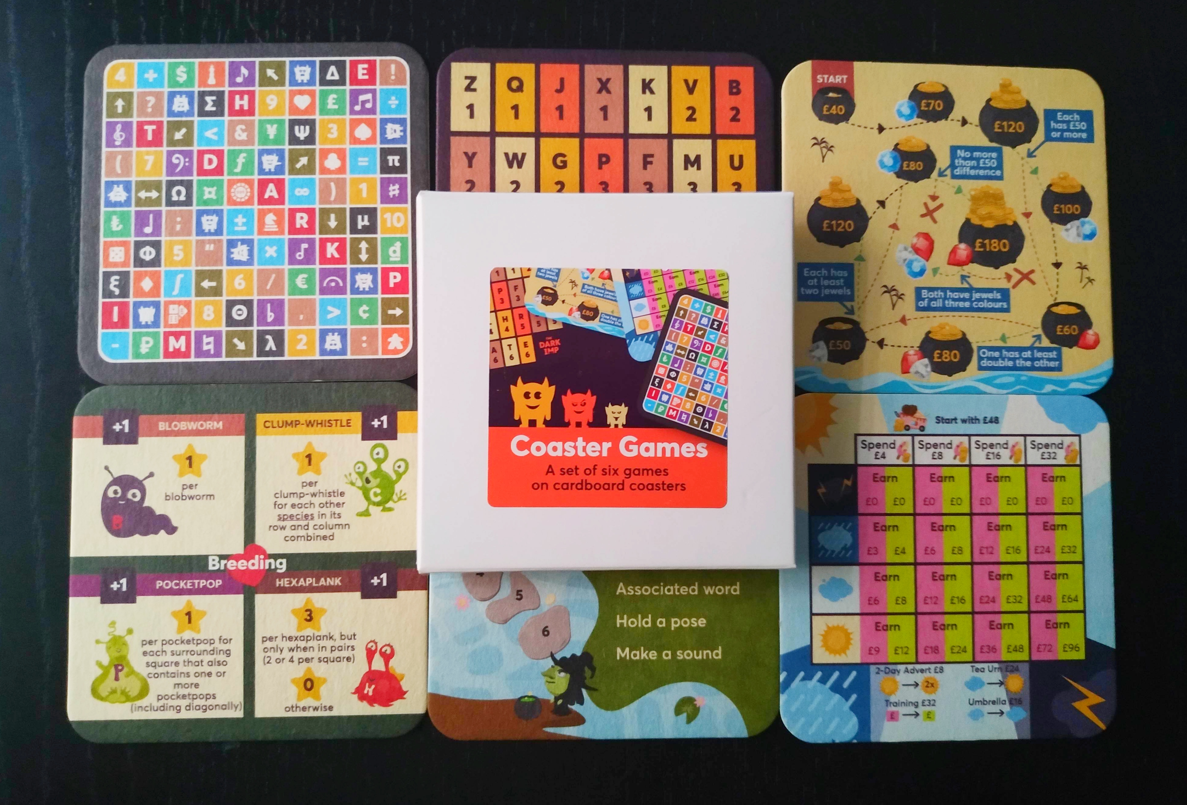Los Coaster Games son un pack de 6 juegos diferentes que vienen juntos en formato posavasos en los que veremos el juego por un lado y las reglas por el otro.