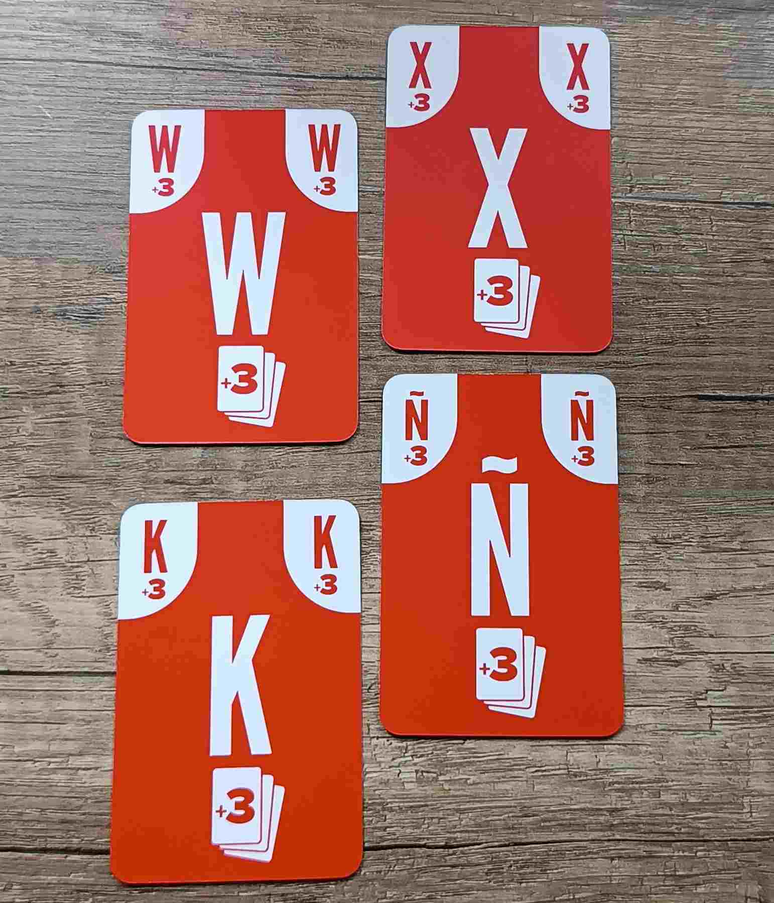 - Cartas de letras +3: Cuando alguien juegue una carta de letras K, Ñ, W o X, deberá entregar tres cartas de sanción a los jugadores que quiera, pudiendo ser las 3 al mismo o repartirlas.