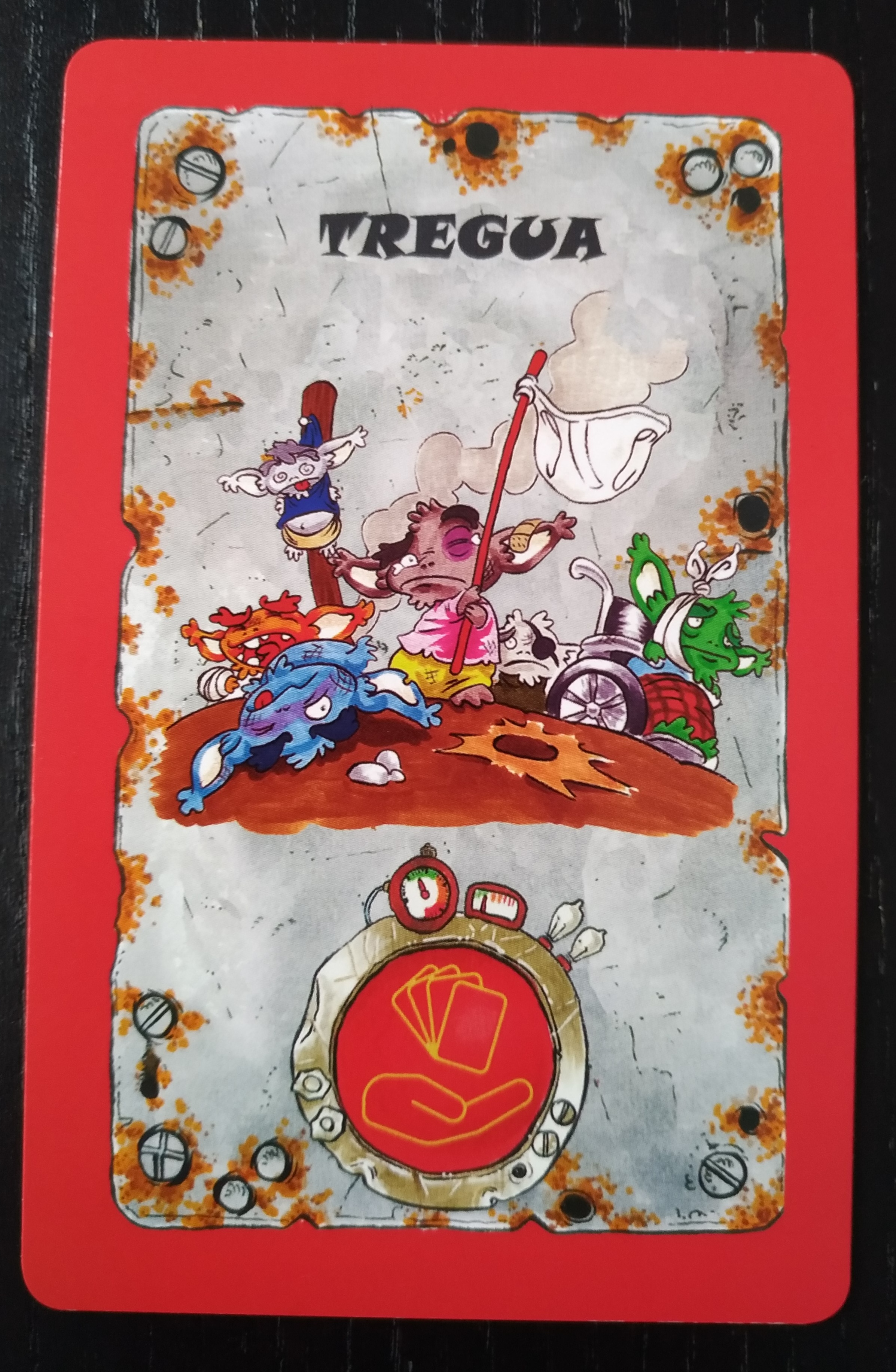• Tregua: Solo se puede usar si al menos uno de los rivales tiene una carta en su aldea. Todos los jugadores menos el que la juega ponen las cartas de tropa de sus aldeas en sus manos y mandan al desguace las demás cartas.