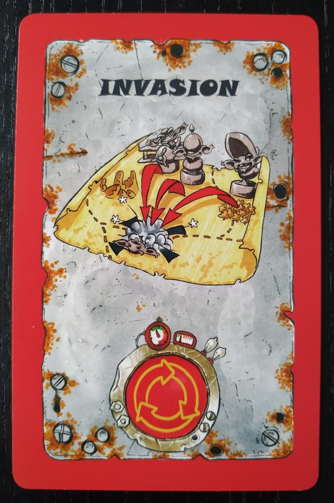 • Invasión: Se podrá jugar si al menos un jugador tiene una carta en su aldea. El jugador que la usa debe elegir izquierda o derecha y, tengan o no cartas en su aldea, pasarán su aldea al lado elegido.