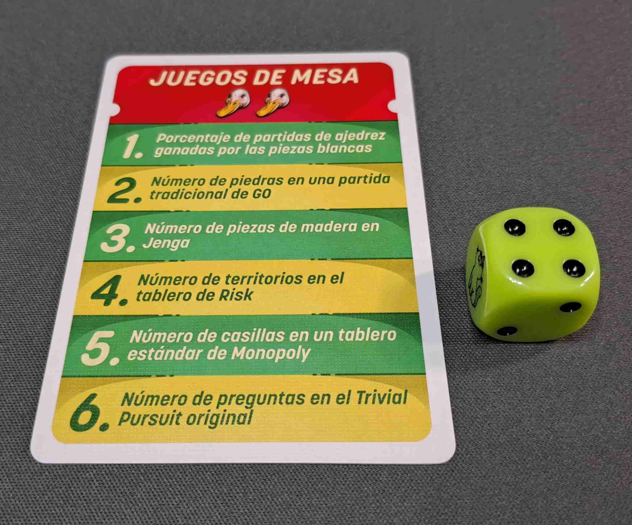 Por otro lado, es cierto que el juego especifica que la elección de la pregunta de la carta debe ser aleatoria, pero hemos comprobado como a alguno de los jugadores se le van los ojos procurando rápidamente ver qué pregunta puede ser mejor para sus intereses. Por este motivo, nosotros hemos incluido para el juego una pequeña regla casera que es incluir un dado normal de seis caras, que será quien determine cuál de las preguntas será la que leerá el jugador en turno.