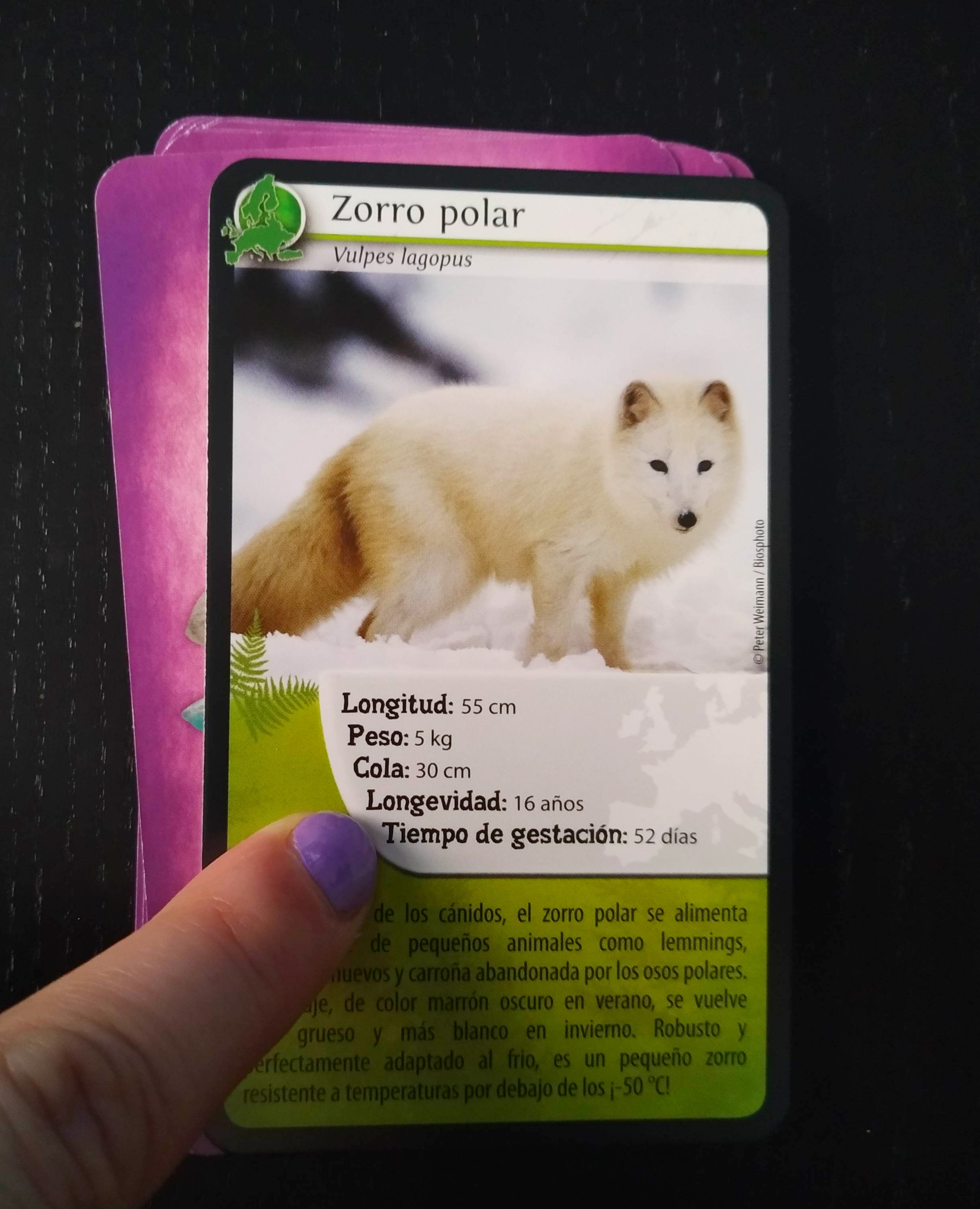 Sus cartas tienen un buen tamaño y grosor. En la parte superior aparece la imagen del animal con todo detalle, en el centro tenemos las características que son longitud, peso, cola, longevidad y tiempo de gestación con las que nos enfrentaremos a nuestros oponentes durante la partida y en la parte inferior nos cuentan en un párrafo algo más sobre cada uno de ellos como dónde vive, cómo se comporta o datos especiales de ellos.