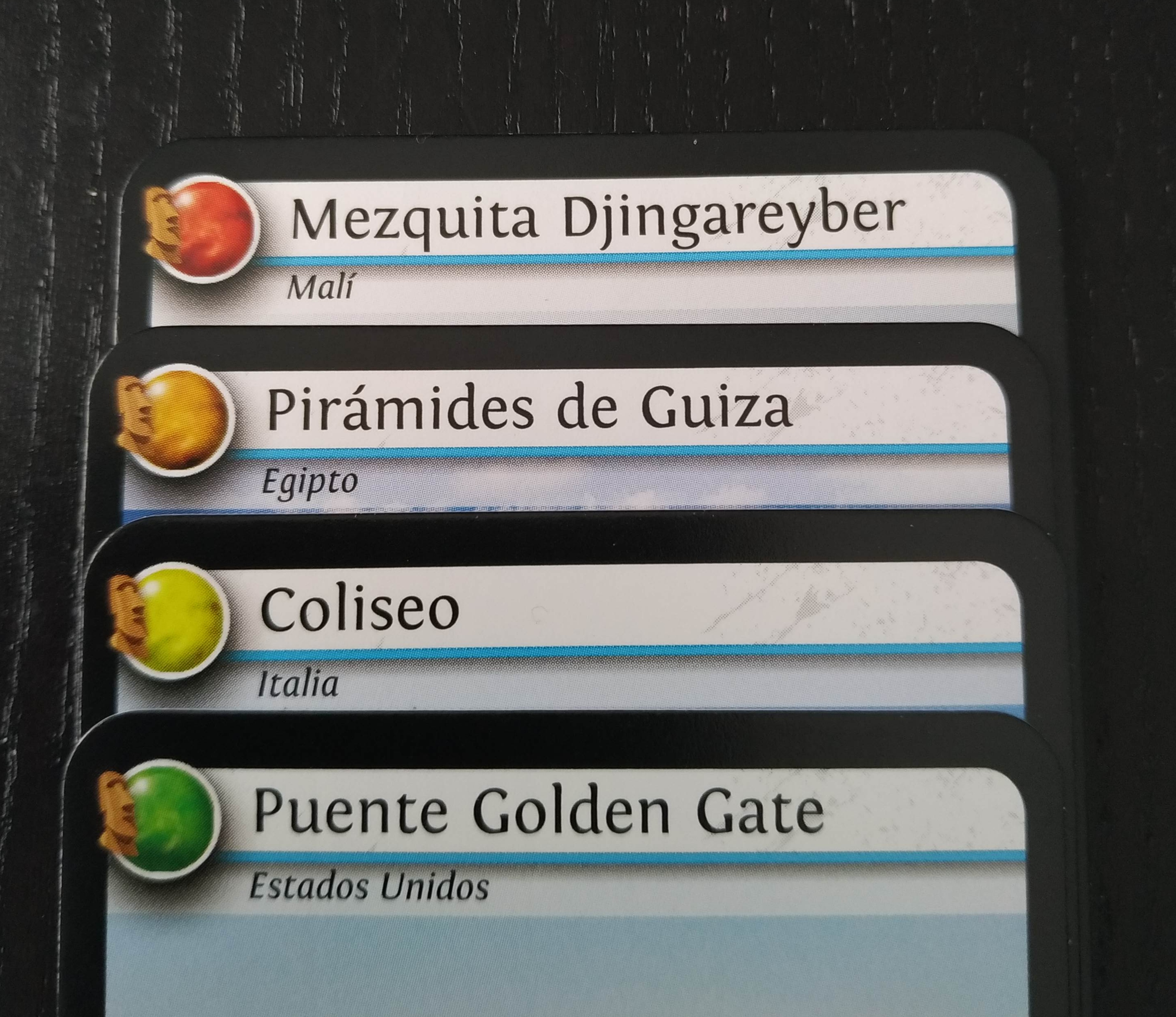 La manera que tenemos para desempatar en el hipotético caso en el que nuestros datos coincidan, se nos propone fijándonos en el grado de conservación de nuestro monumento, que nos lo indican los círculos de 4 colores de la parte superior izquierda en cada carta.