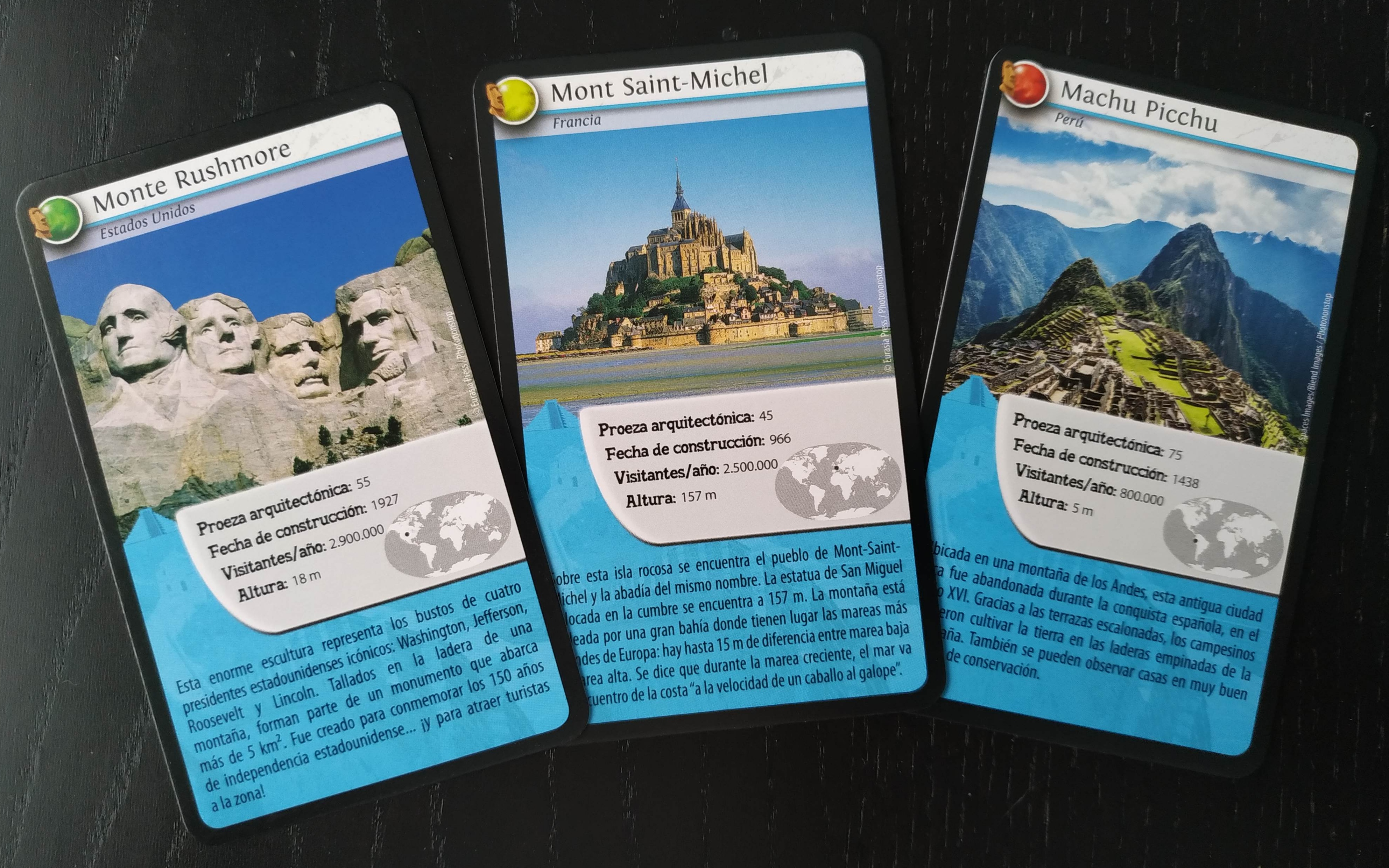 Las cartas son de buen grosor y en ellas tenemos en la parte superior las imágenes de cada monumento, a todo color, en la parte central un espacio gris con un mapa ubicando dónde se encuentra dicho monumento en el mundo junto a sus características y un párrafo en la parte inferior que nos cuenta más detalles sobre él.
