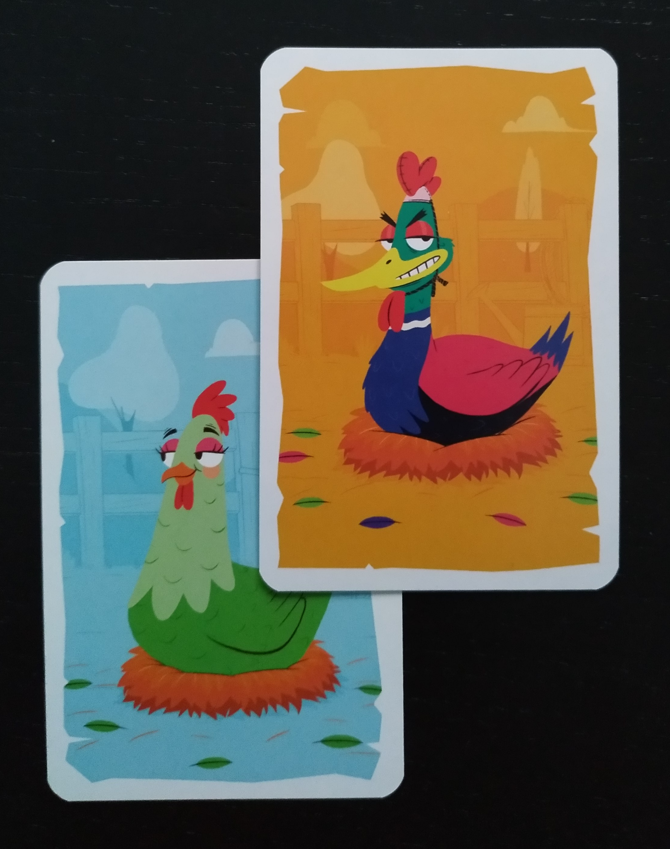 Las cartas son de un grosor óptimo y merece la pena pararse a observar cada uno de los tipos de cartas con las que jugaremos. Gallinas de diferentes colores reposando tranquilamente, un gallo luciendo sus plumas, patos que sonríen porque creen que conseguirán engañarnos y el perro que vigila como en todo buen corral son algunos de los personajes con los que compartiremos partidas.