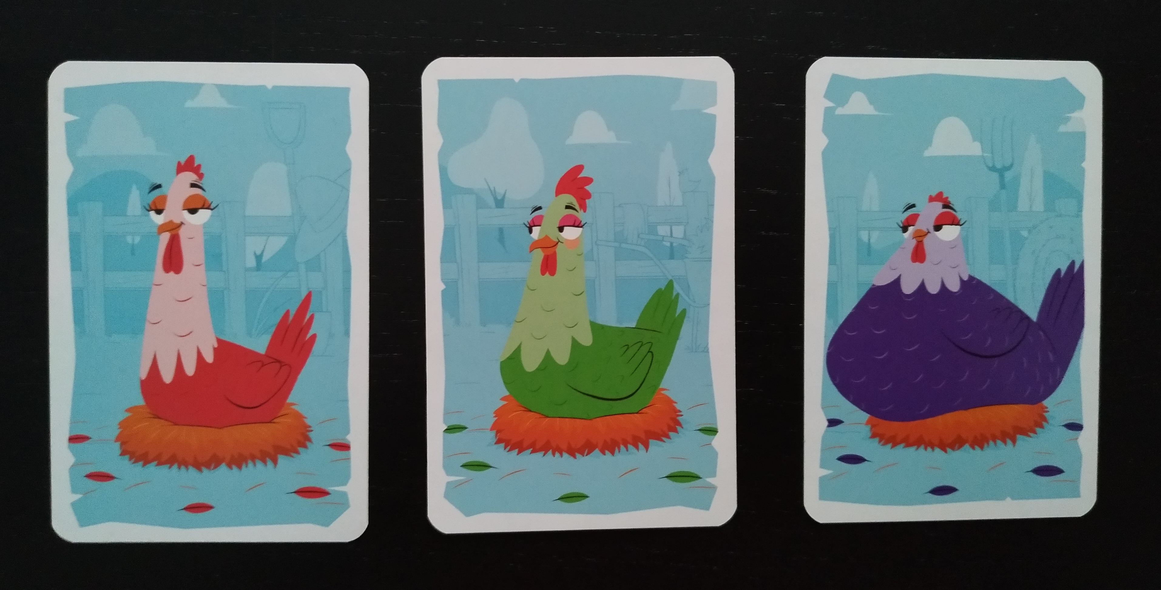 A esto debemos sumarle el azar del mazo de robo que nos dará cartas que quizá nos vengan bien para lograr nuestro objetivo de gallinas del mismo color o todo lo contrario, se nos dé tan mal que no consigamos los colores perseguidos y tengamos que tomar otro camino totalmente diferente. Por todo ello, la rejugabilidad es bastante alta y nunca una partida te parecerá igual que otra.