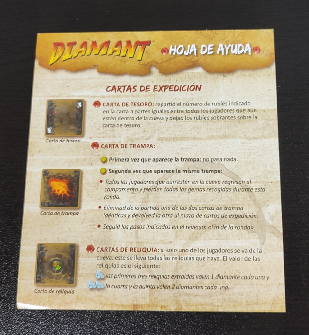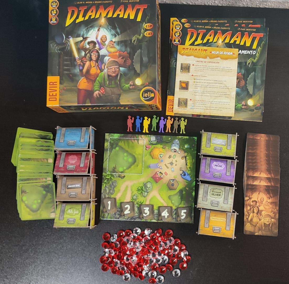 Diamant es un juego en el que representaremos a una serie de exploradores que desean encontrar la mayor cantidad de tesoros posibles en sus expediciones. El problema es que no solo se encontrarán con diamantes y reliquias sino que también un montón de diferentes trampas y peligros que arruinaran todo lo conseguido.