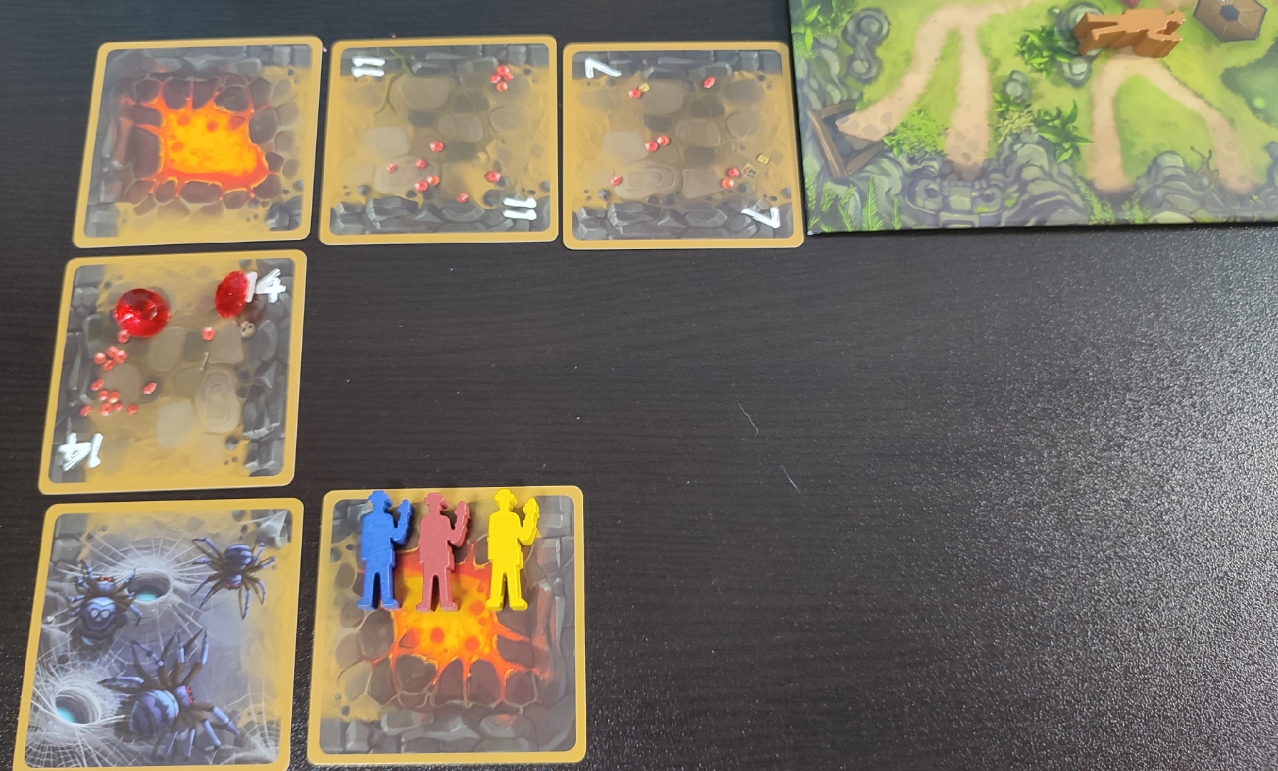 Y, por último, si lo que aparece es un peligro hay que ver si ese mismo peligro ha salido ya o no. Si es la primera vez que aparece, no pasa nada y la expedición podrá continuar, pero si aparece por segunda vez, se acaba la ronda y todos los exploradores que estuvieran en la expedición mueren, y lo peor de todo, pierden todos los rubís que hubieran encontrado durante esta expedición, es decir, los que aún no estaban en el cofre.